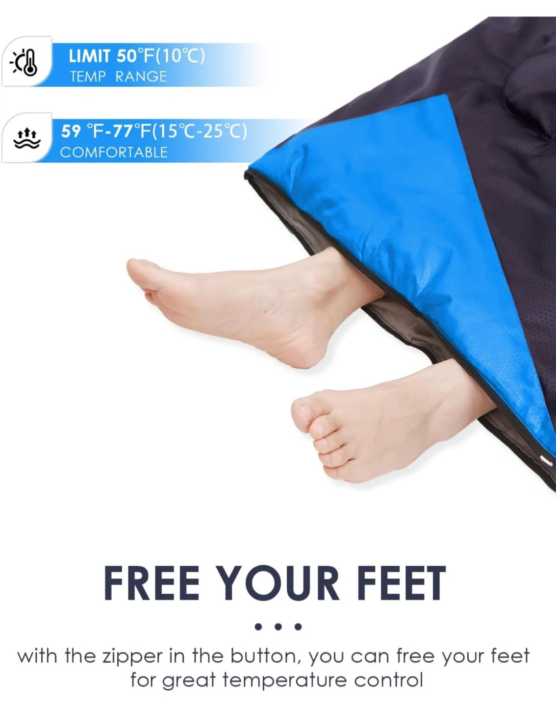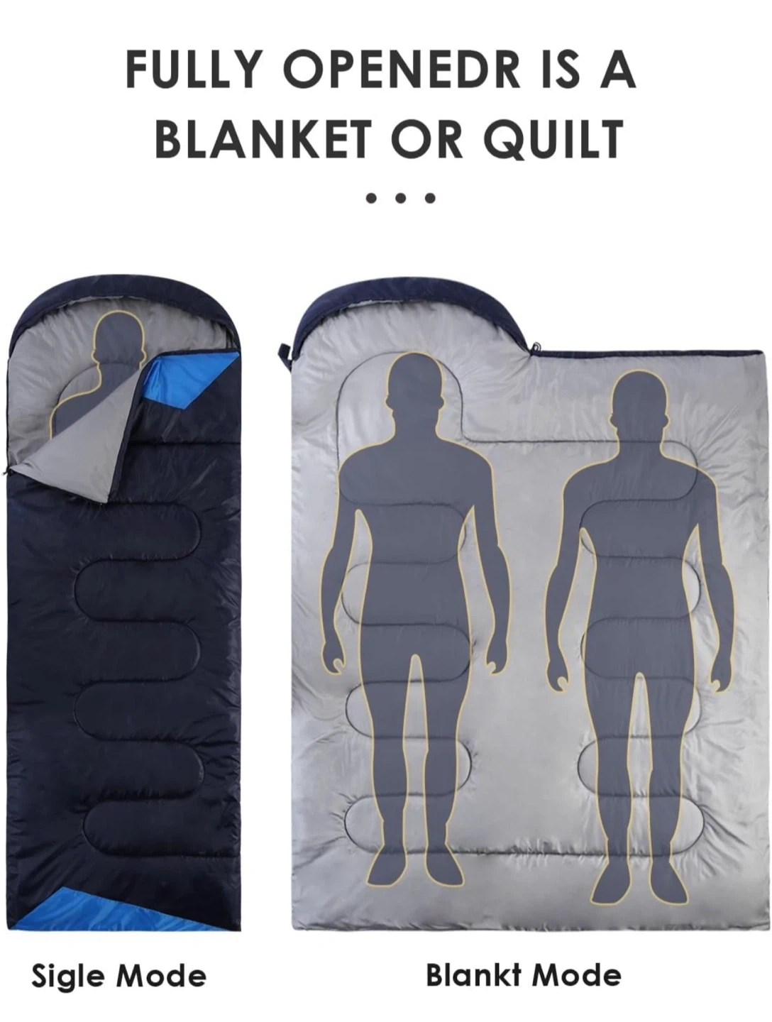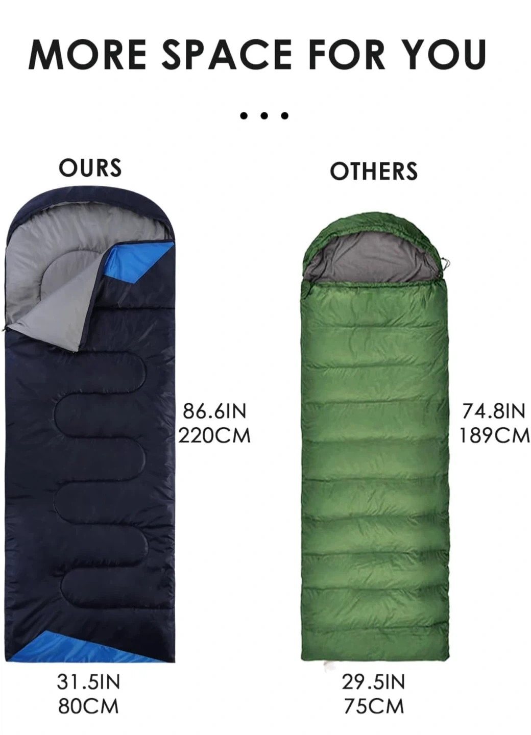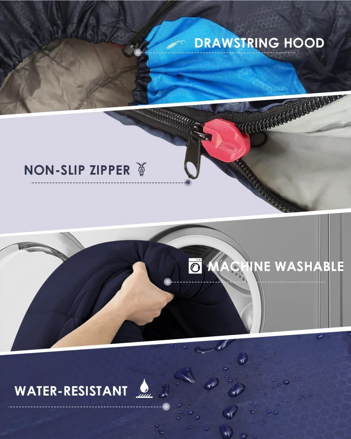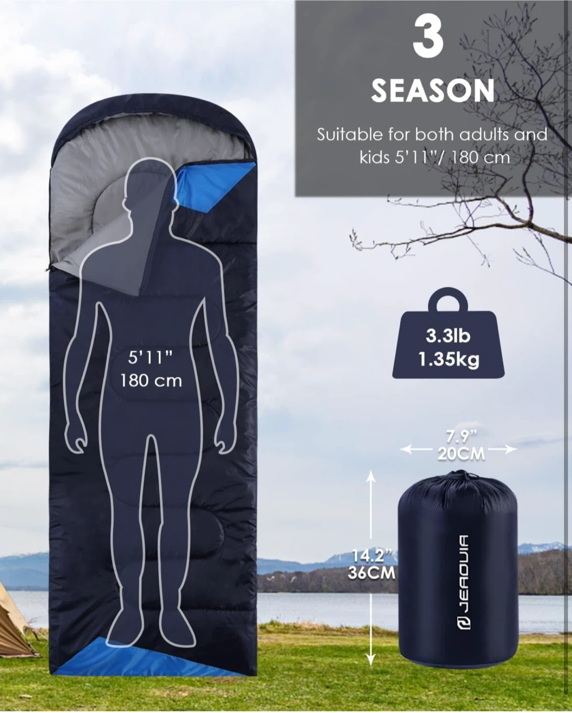 Get ready for your next camping trip with this Jearouia 3-season sleeping bag! It's suitable for both adults and kids up to 5'11" (180cm). - Colour: Navy Blue - Drawstring hood - Non-slip zipper - Machine washable - Water-resistant - Can be fully opened as a blanket or quilt - Packed size: 14.2" (36cm) x 7.9" (20cm) - Weight: 3.3lb (1.35kg)