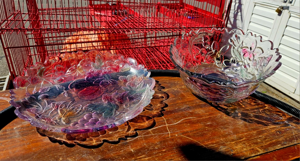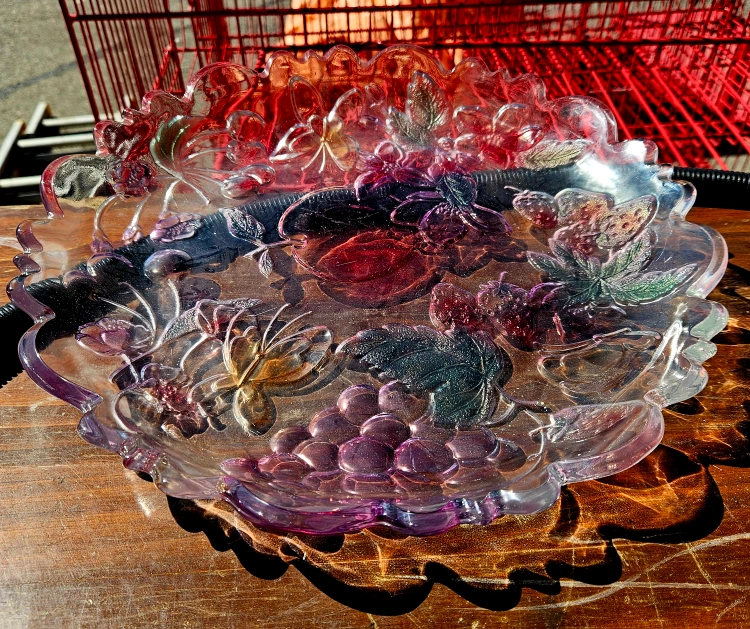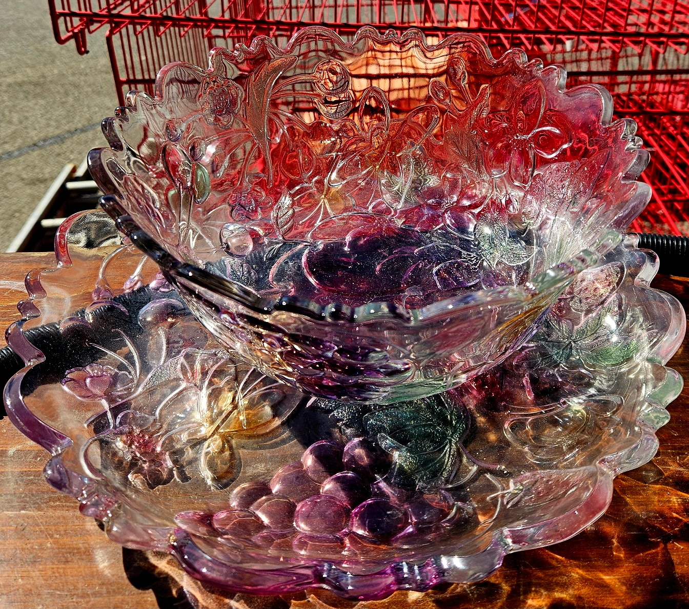 25Selling a beautiful decorative glass bowl and plate set! The set features a lovely floral and fruit design with grapes and butterflies. Perfect for adding a touch of elegance to your home decor