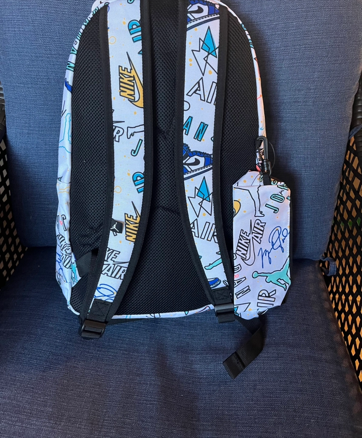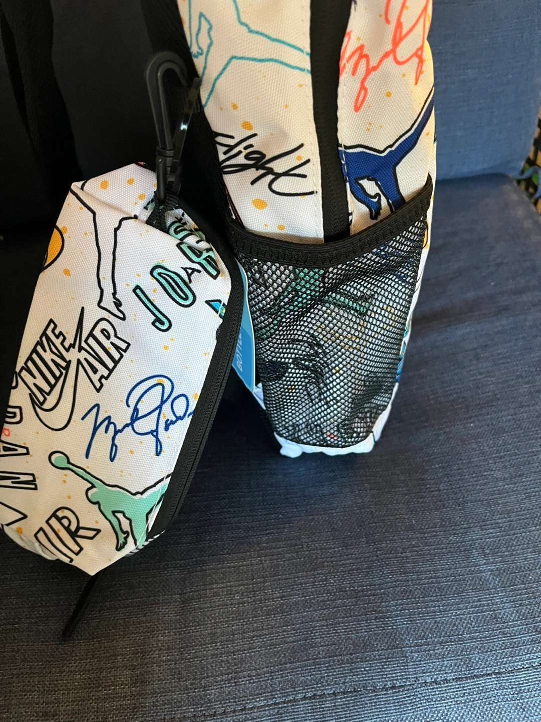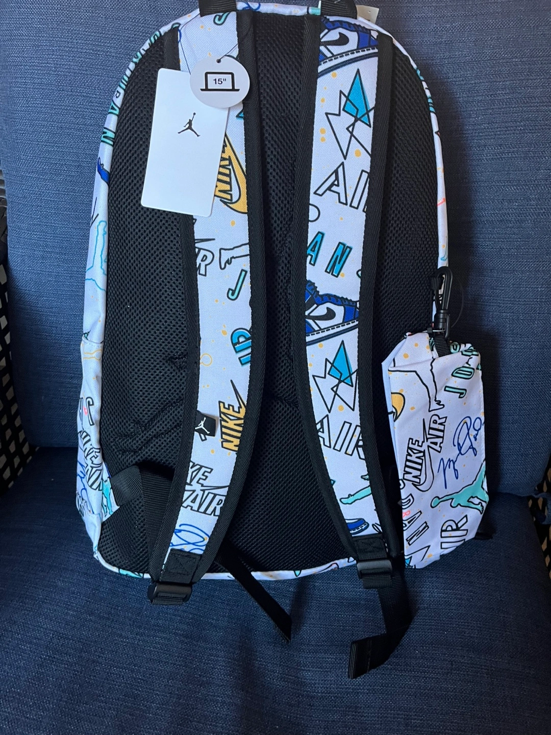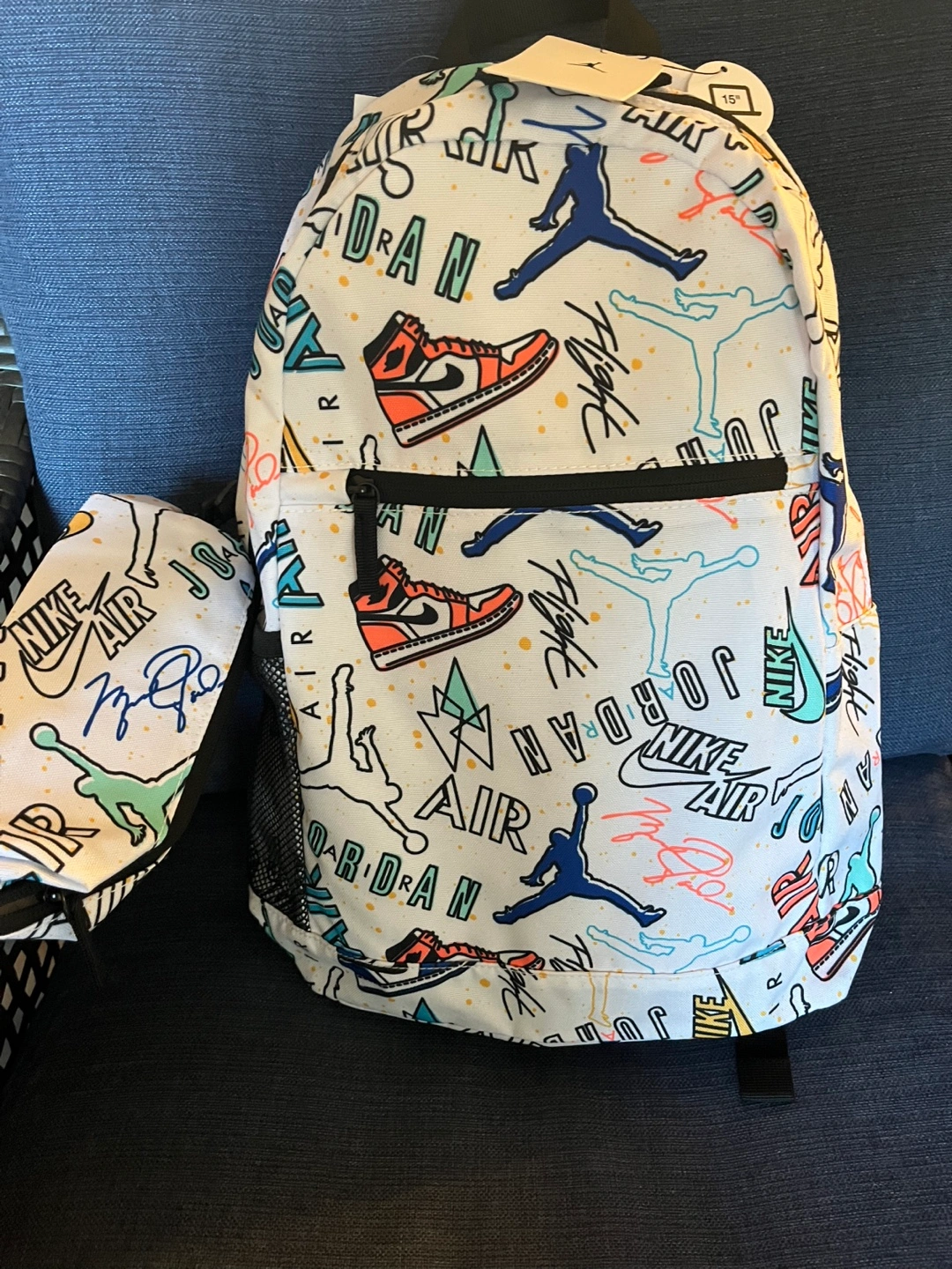 brand new backpack with pencil ✏️ case 2 piece set with tags Check out this cool Nike Air Jordan backpack! It comes with a matching pencil case, perfect for school or everyday use. The backpack has a fun, all-over print featuring the iconic Air Jordan logo and designs. It's brand new from smoke and pet free home