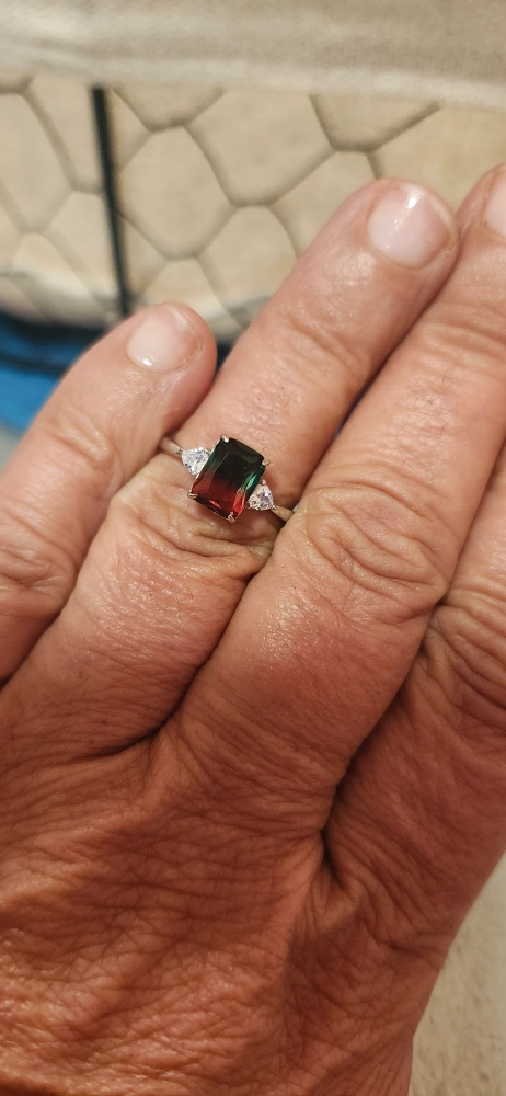 Selling a ring with a colour changing gemstone in a silver tone setting. It's a size 6 and new with tag. . The ring also features two smaller cubic zirconia on either side of the main stone