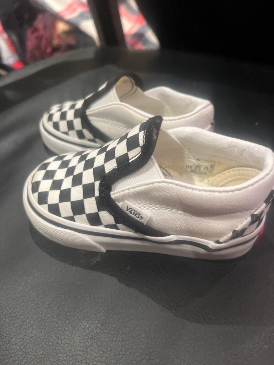 These adorable Vans Classic Slip-On shoes are perfect for your little one! They feature the iconic checkerboard pattern in black and white. The size is US 5 for kids. They're in great condition and ready for a new home! Excellent new clean condition