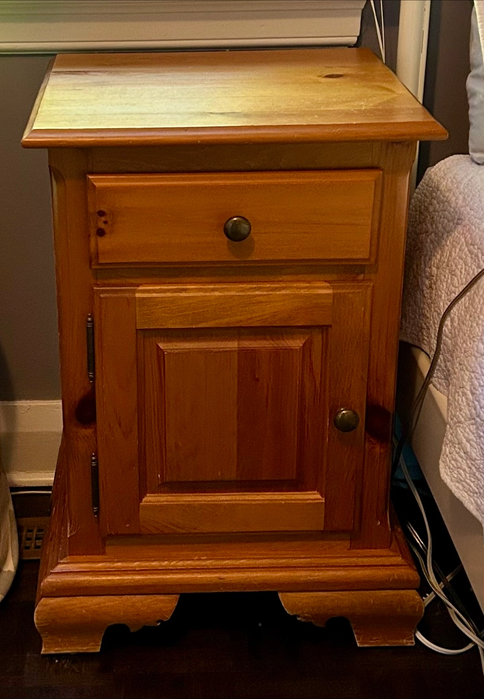 Selling a charming wooden nightstand! It features a drawer and a cabinet with a door, perfect for bedside storage. It's in ok condition and ready to add a touch of warmth to your bedroom. Perfect for someone who wants to refinish solid wood furniture. Matches dresser I posted. 2 available. You can buy one or both.