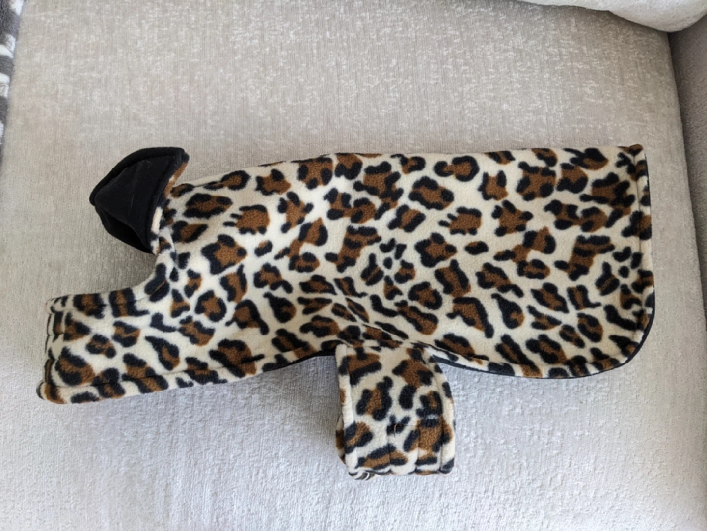 Here's a cozy leopard print dog coat to keep your furry friend warm! It's in great condition and ready for a new home. For a small dog, never used.