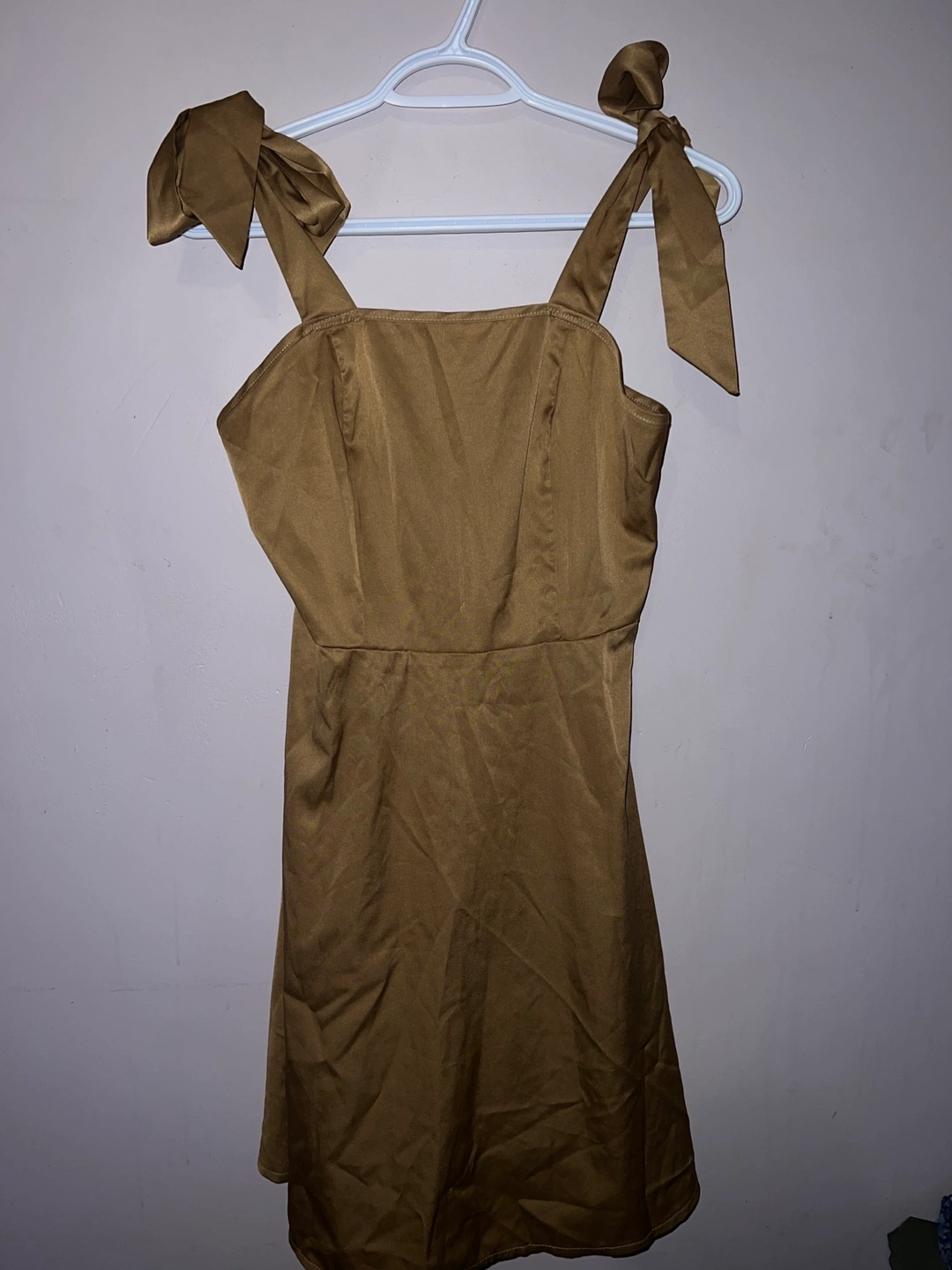 A cute olive green dress! It has tie straps, so you can adjust the length to your liking. Perfect for a night out or a casual day. It's in great condition and ready for a new home