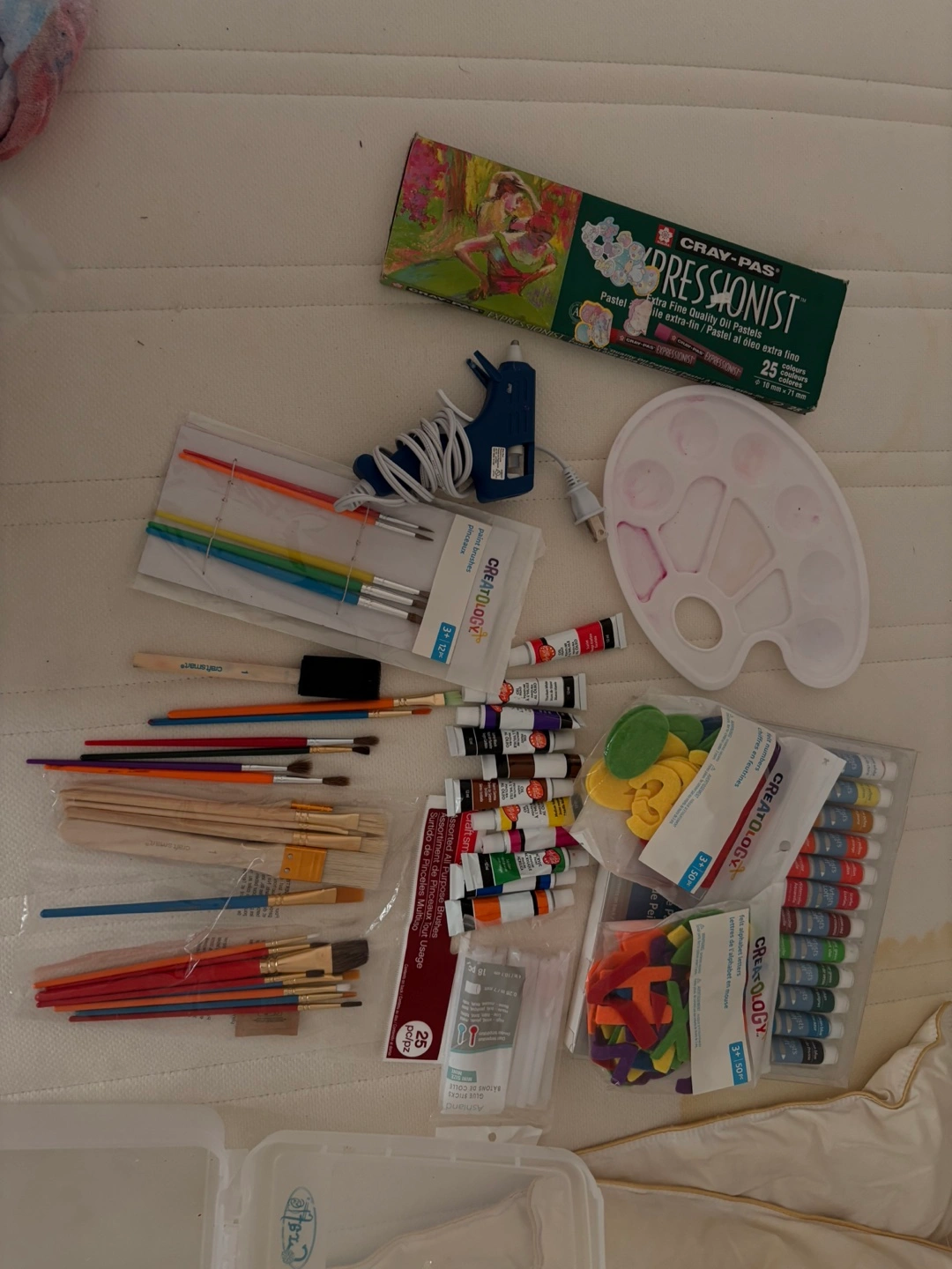 Selling lots of art supplies that are great for kids. Includes - 20+ paint brushes (some have never been used) - 11 different colours of oil paint - 24 different colours of watercolour paint - 24 colours of oil pastels (used but mainly the colours white, green and purple) - a hot glue gun - hot glue sticks (a closed pack) - open hot glue pack - Containers to mix paint Comes with the transparent box to keep the art supplies in! Everything is $40! If you are a school/teacher/daycare worker, I am willing to negotiate or donate! This is a great addition for kids but I will have to sell it if away since we are moving countries and I will have no space in my luggage! Pick up in Burnaby ☺️ cash is preferred