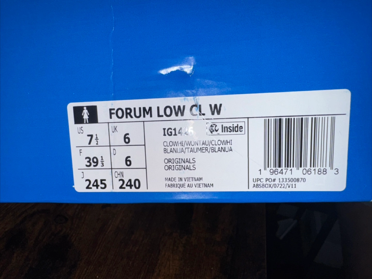 Selling a pair of Adidas Forum Low CL W shoes in size 7.5 US. They are in great condition and come with the original box. Haven’t worn out, only tried on.