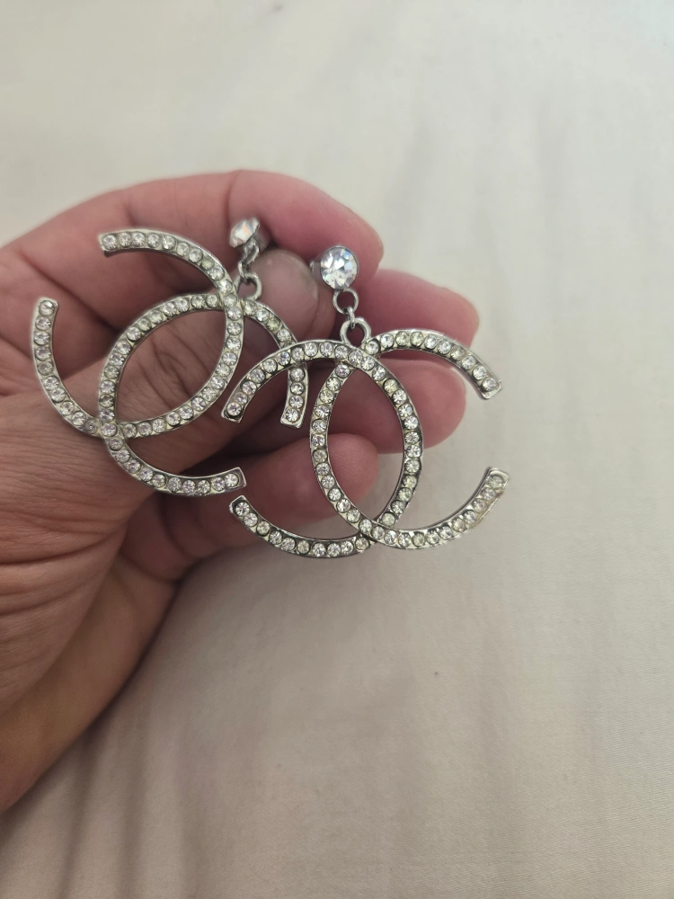 These are a pair of Chanel dangle earrings. They feature the iconic interlocking CC logo design, and are adorned with rhinestones. Perfect for adding a touch of sparkle to any outfit!