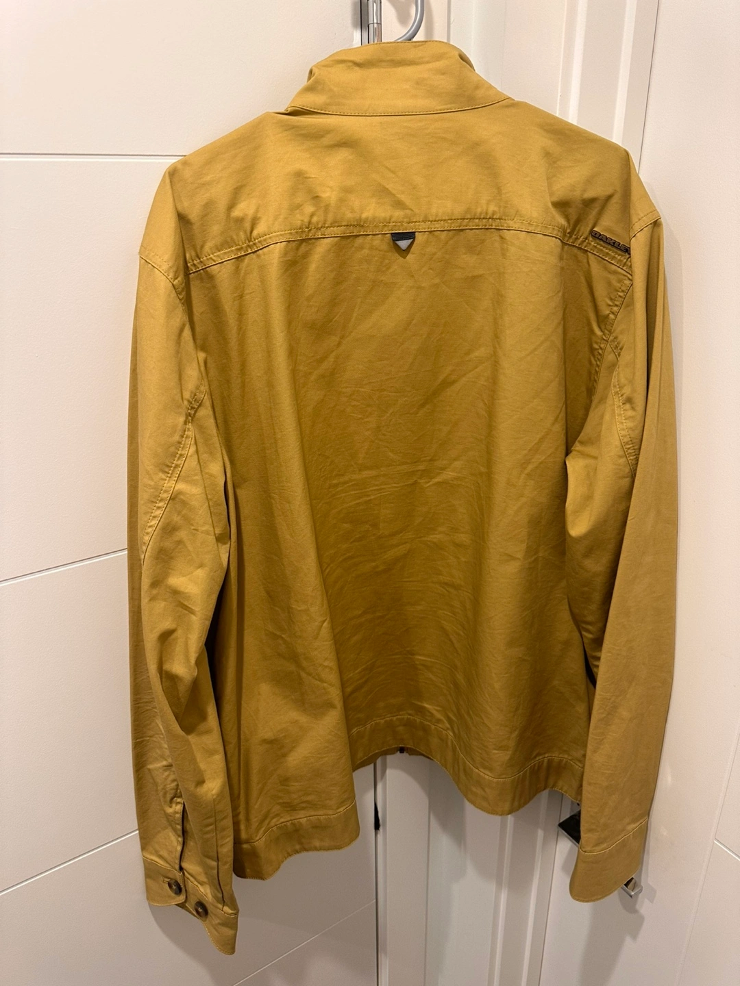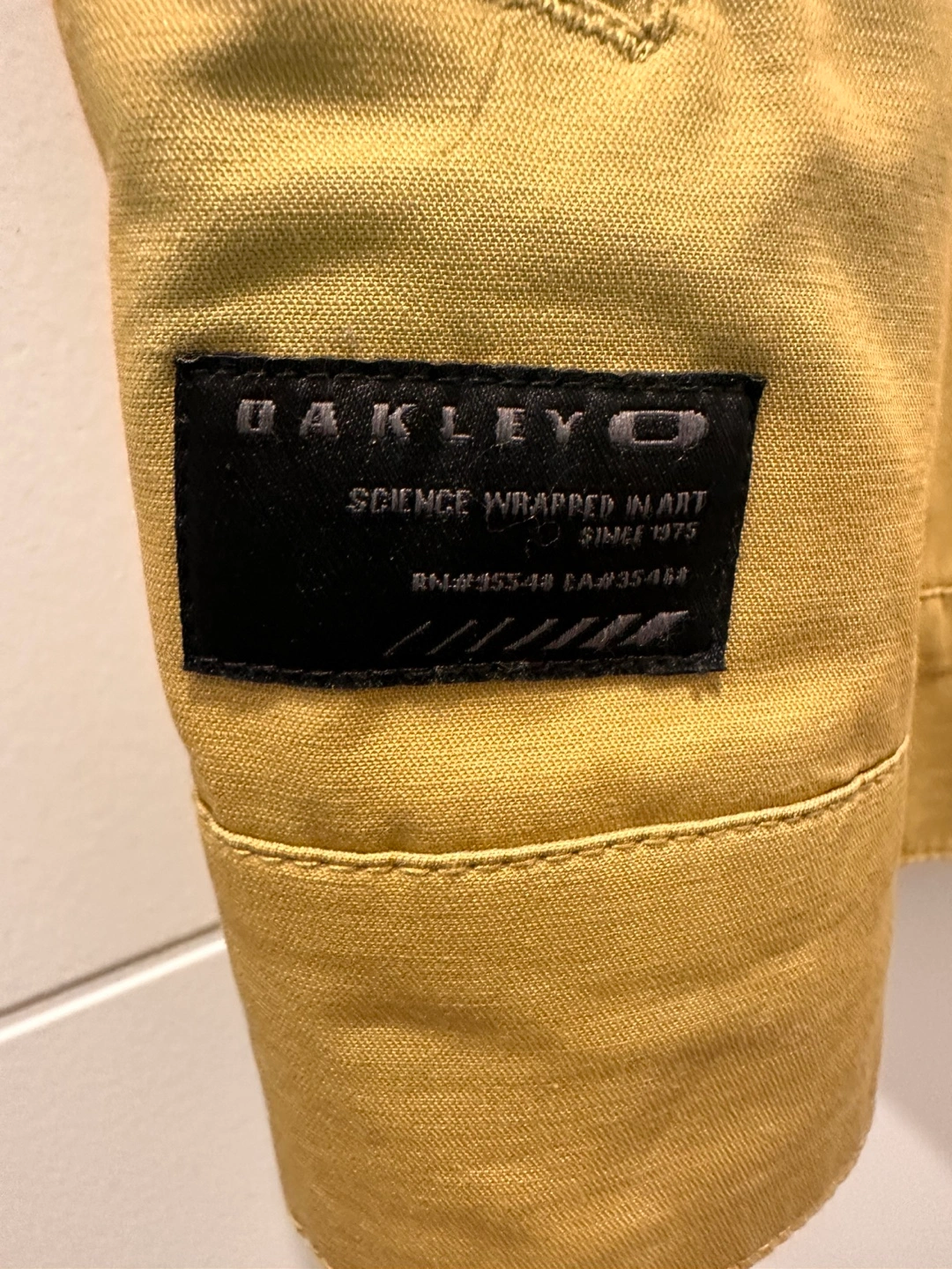 Oakley jacket in size XXL/110. The jacket is a stylish yellow colour. It features a full zip closure and a unique design.