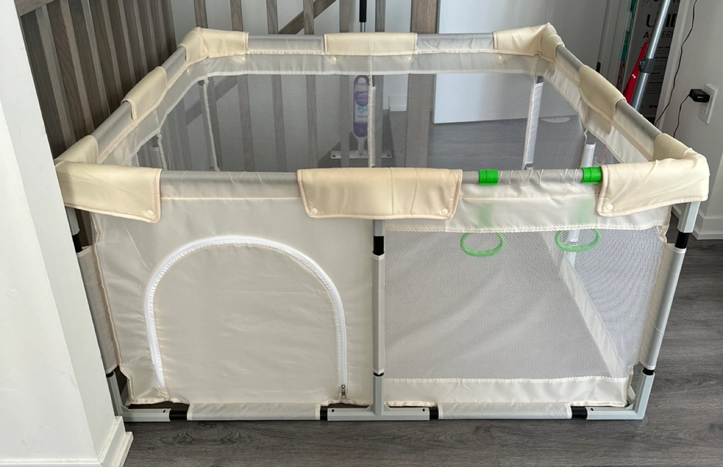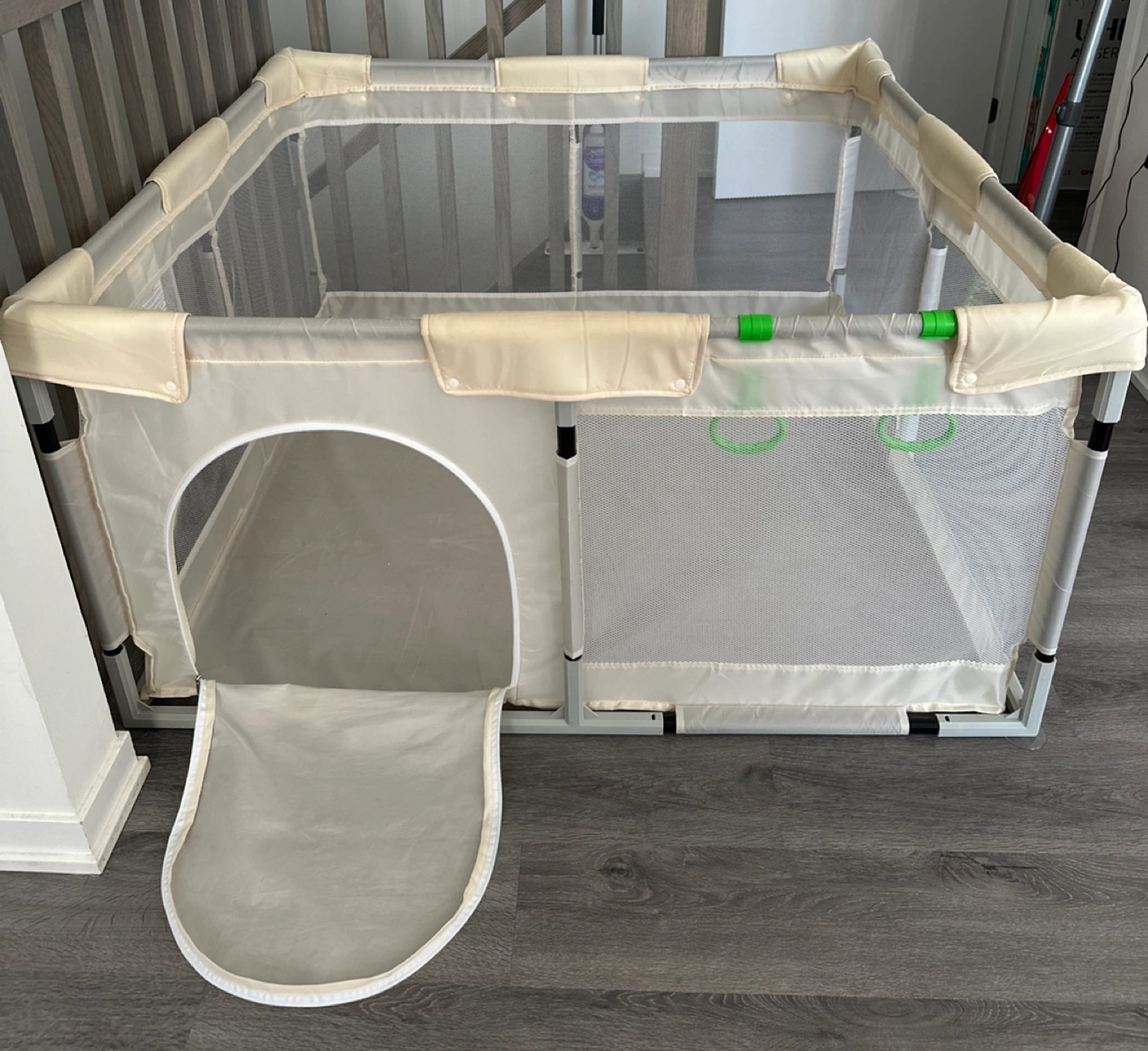 Selling a baby playpen in great condition! It's perfect for keeping your little one safe and entertained. The playpen features a zippered door for easy access and breathable mesh sides for visibility. It also has some fun hanging rings for added engagement. A safe and secure space for your baby to play!