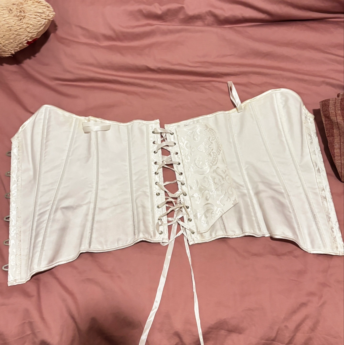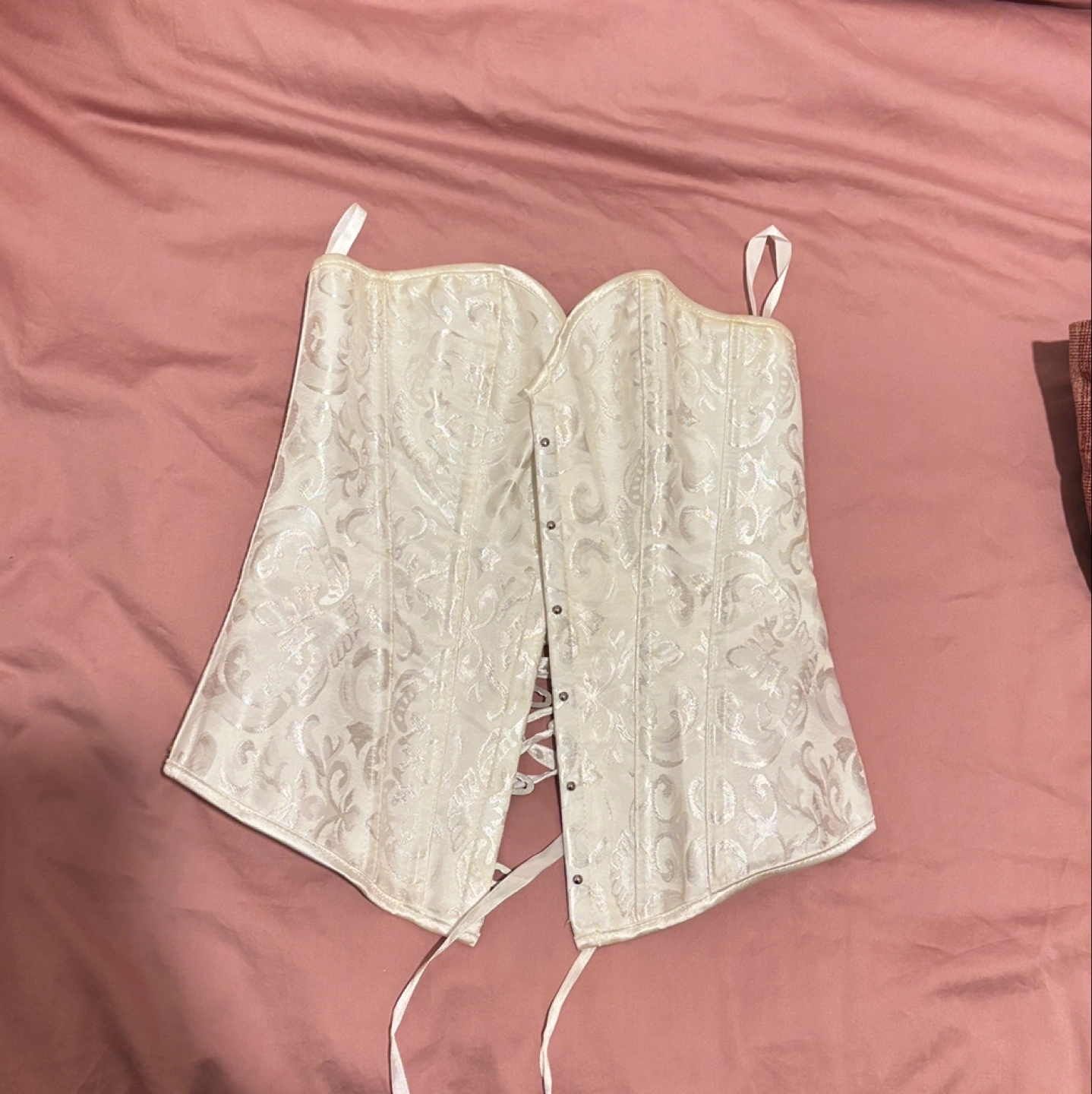 Selling a white corset top. It's in great condition and ready for a new home! It features a lace-up design and delicate detailing.