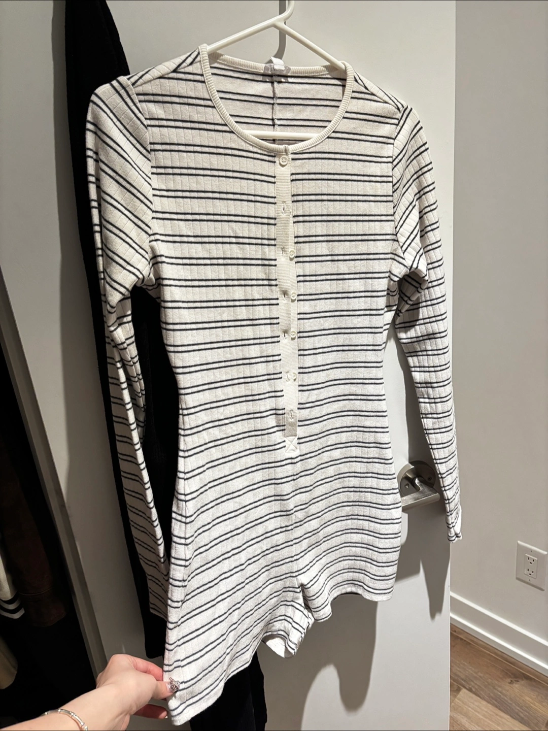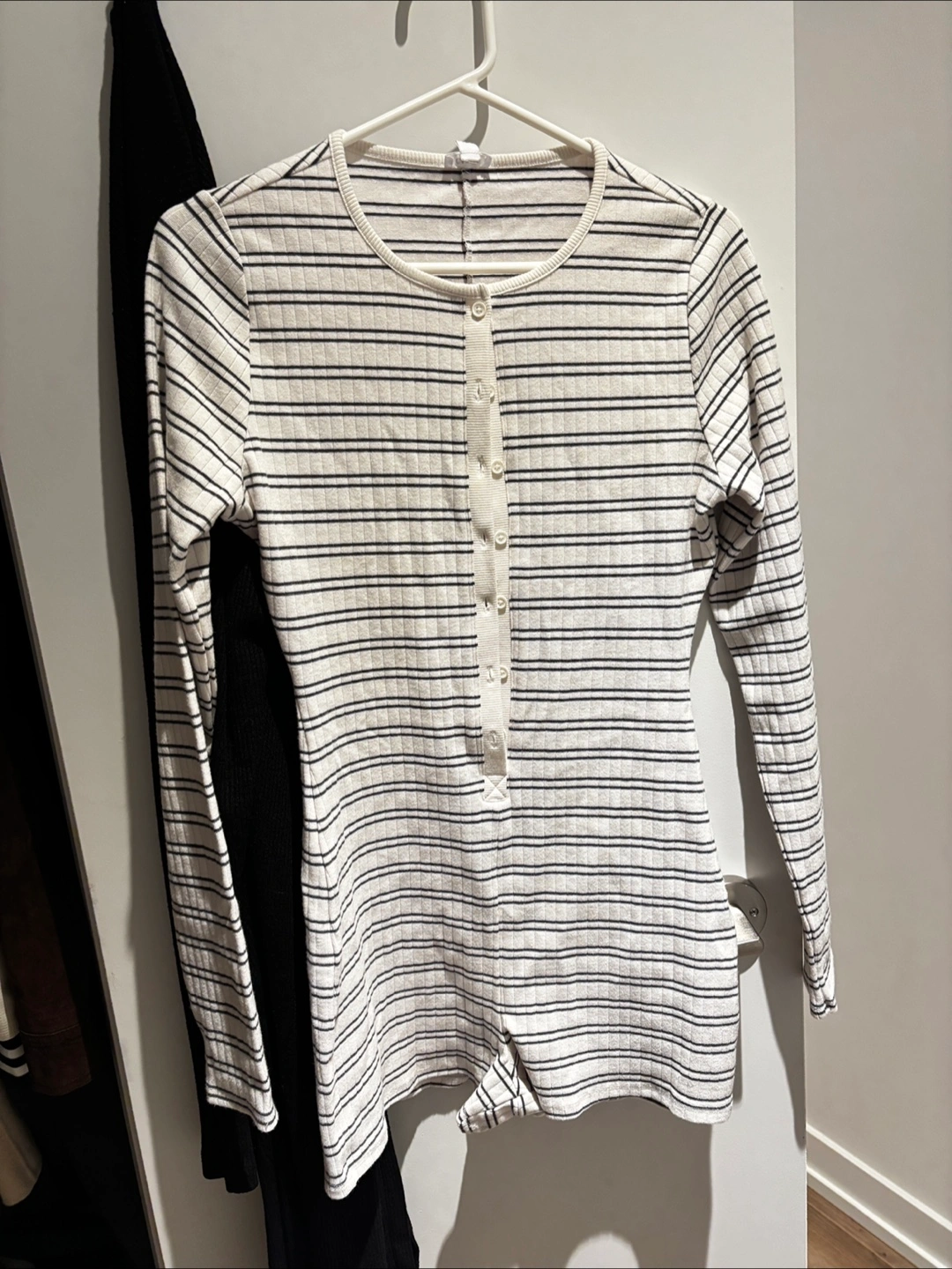 Cozy bodysuit in a striped pattern! Perfect for lounging around the house or a casual day out. It's a size small and in great condition. Brandnew
