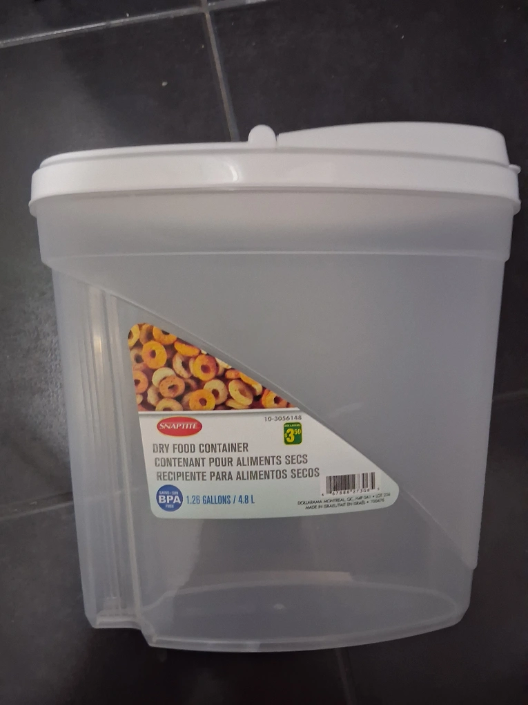 Selling a Snap-tite dry food container! It holds 1.26 gallons / 4.8 L. Originally bought for $3.50 at Dollarama. Pick up only, No delivery.