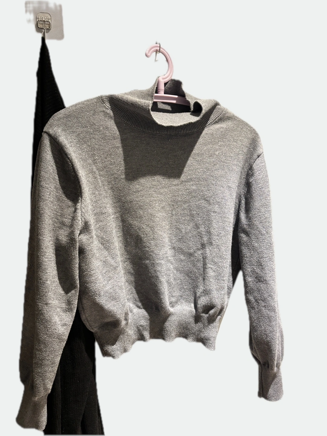 Selling a comfy grey knit sweater! It's in great condition and perfect for layering during the cooler months. The neutral colour makes it easy to match with any outfit. It's a stylish and cozy addition to your wardrobe!