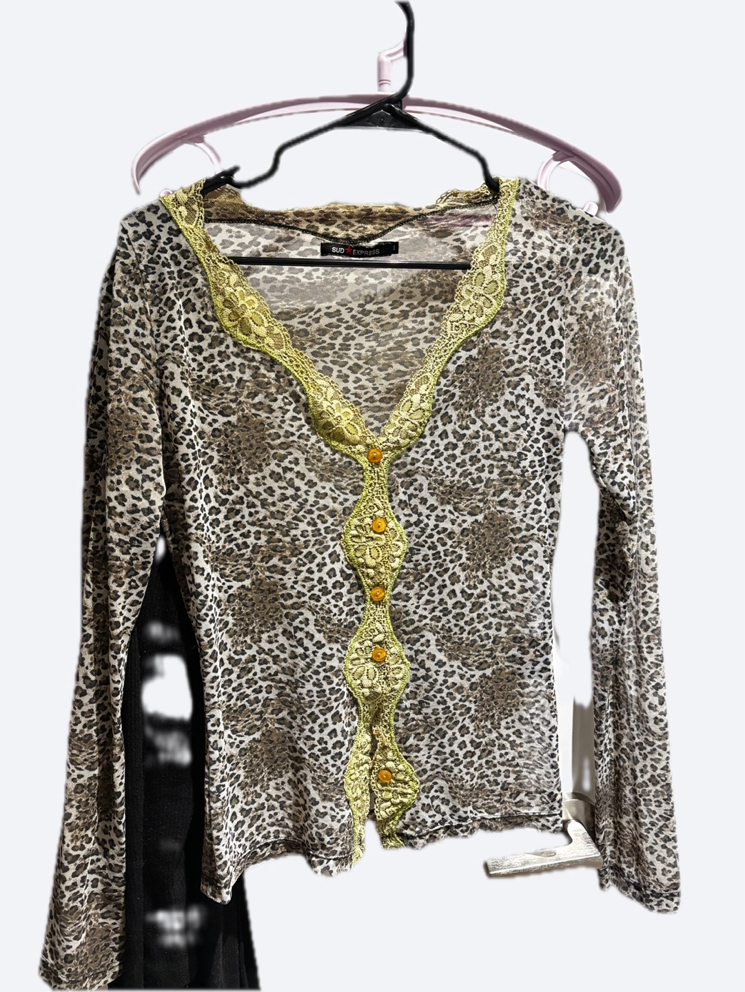 Cute Sud Express long sleeve top with a leopard print. Features a unique design with gold-coloured trim and buttons.