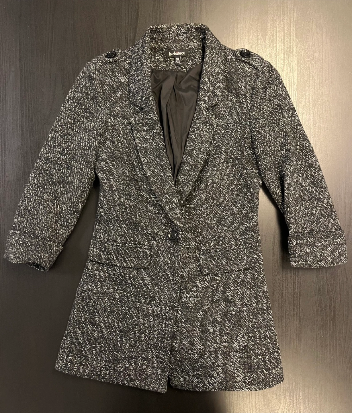 Selling a lovely Le Chateau blazer coat in a grey tweed-like material! It's a size XSand features a classic design with a single button closure. In perfect condition - selling for $15 (accepting offers)