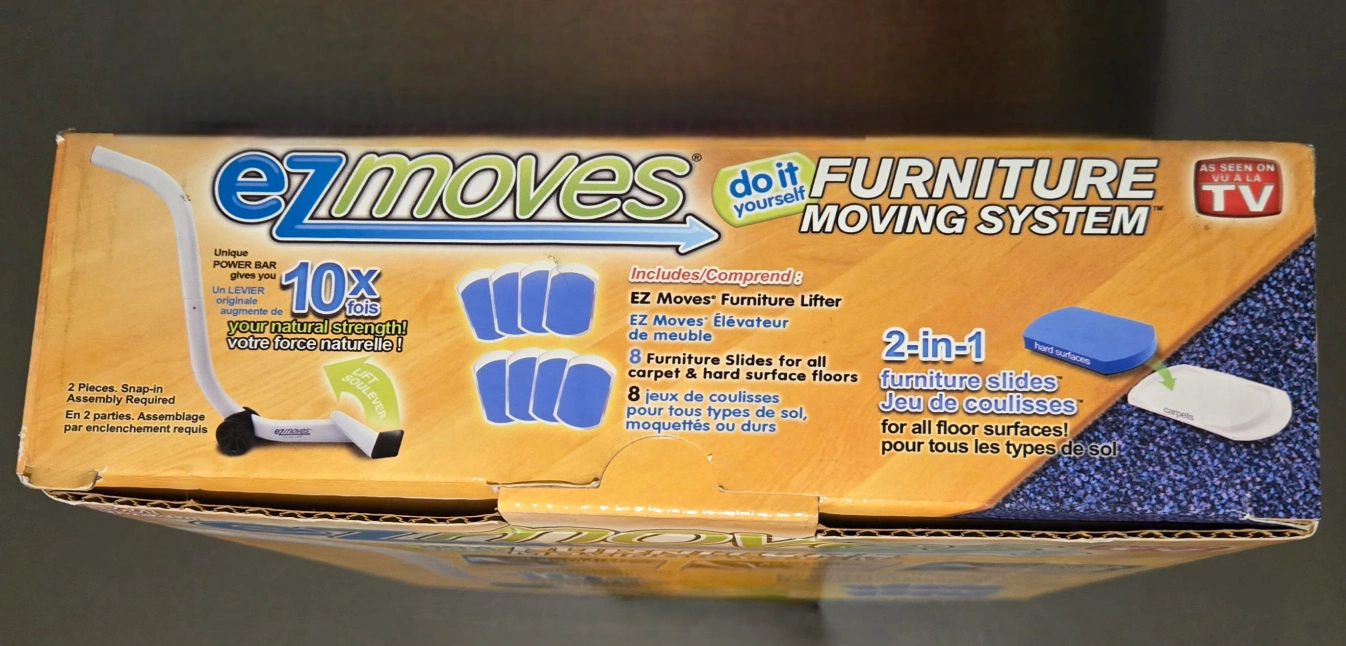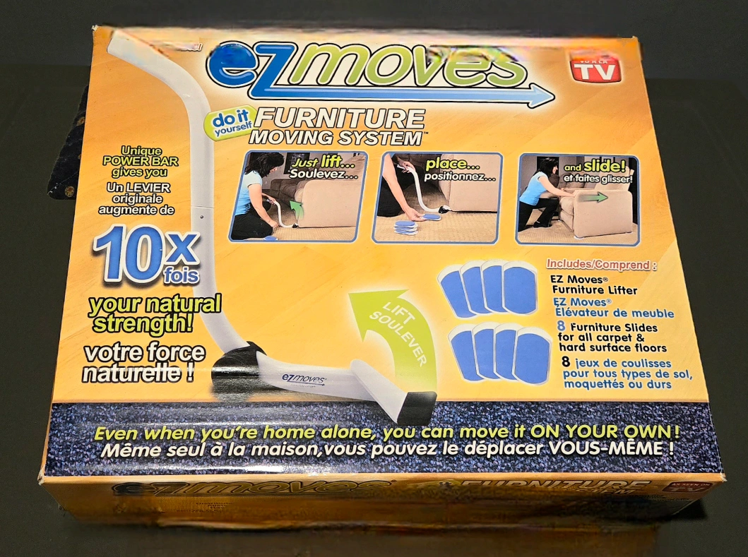 EZ Moves Furniture Moving System helps you move furniture on your own. Includes the EZ Moves Furniture Lifter and 8 Furniture Slides for all carpet and hard surface floors. The unique POWER BAR gives you 10x your natural strength. Brand new in box.