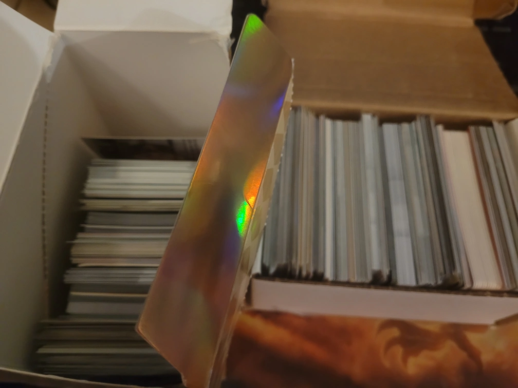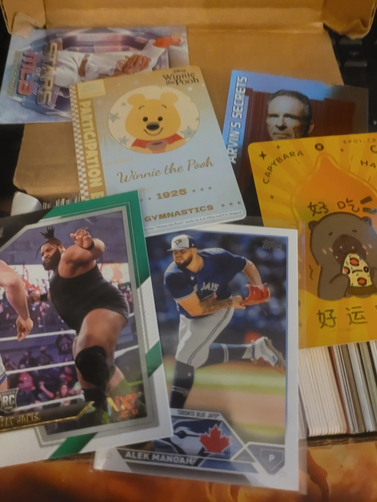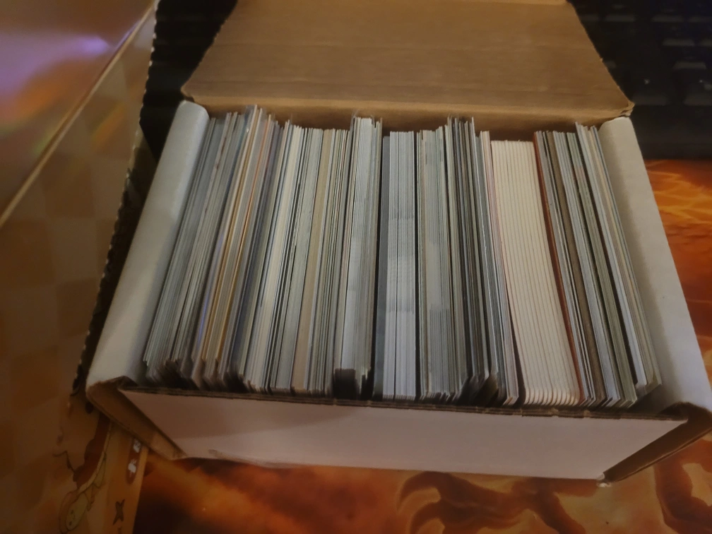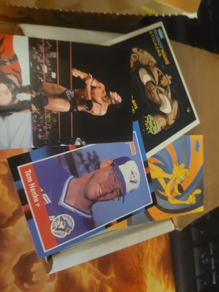 Selling a box filled with various trading cards! There's a mix of sports cards, stickers, and other collectible cards inside. Perfect for anyone looking to expand their collection or start a new hobby