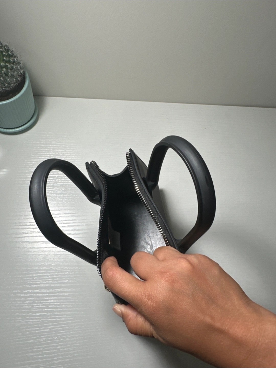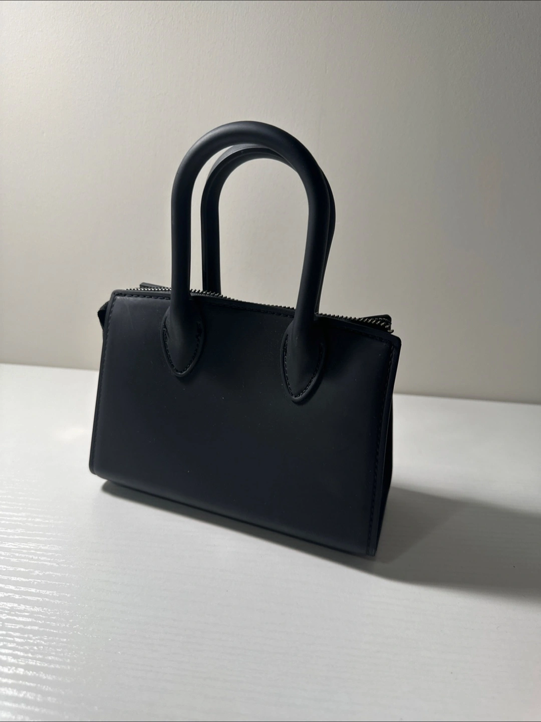 This is a cute mini handbag in black! It has a zipper closure and handles. Perfect for carrying small items