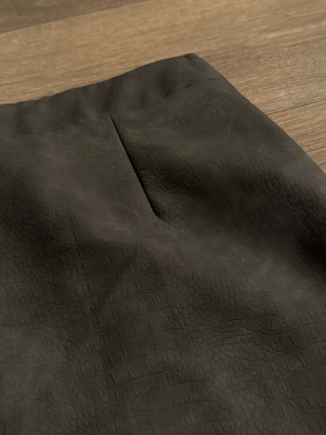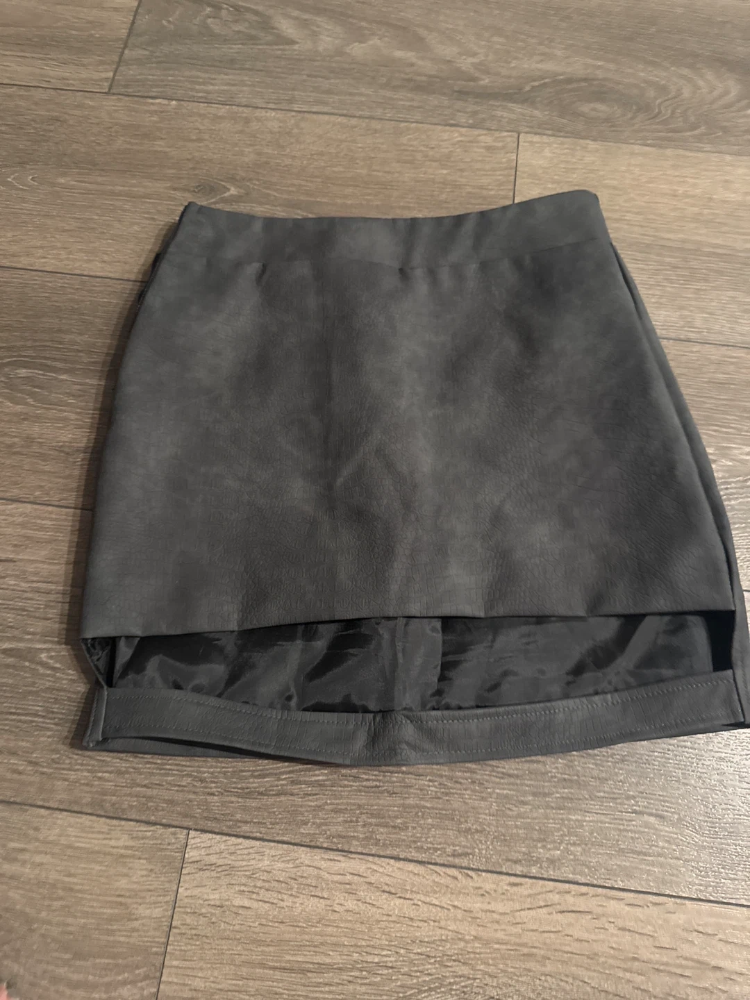 Selling a cute grey mini skirt! It has a faux leather texture that looks like crocodile skin. The skirt is in great condition and would be a stylish addition to any wardrobe