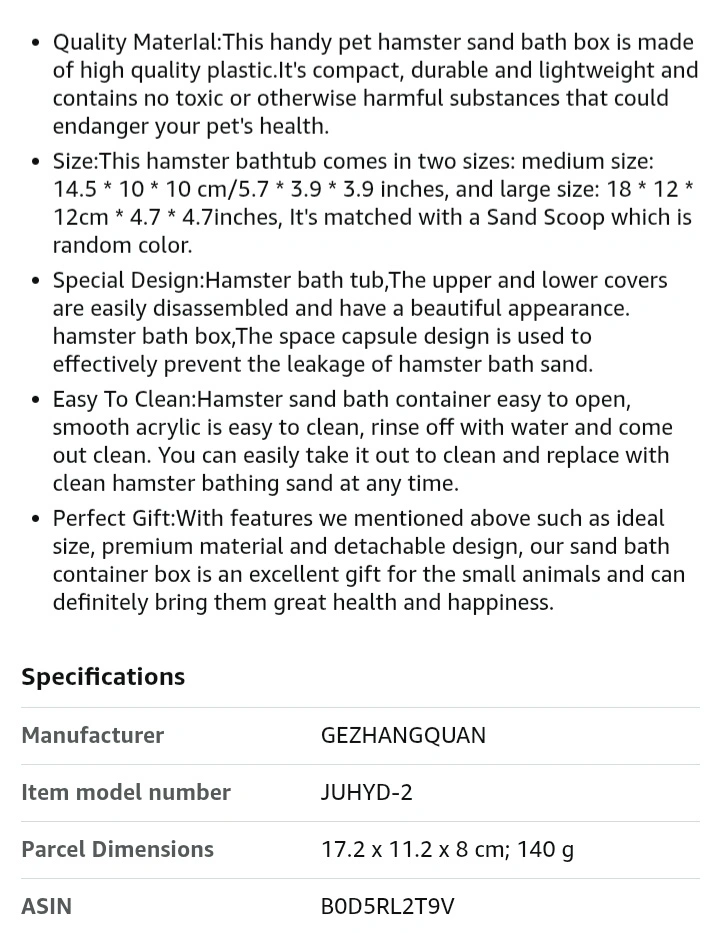 NEW! Hamster Sand Bathroom - see images for details - click image to enlarge - scroll to left to see more images PLEASE "FOLLOW" ME, AS I OFFER A VARIETY OF DIFFERENT ITEMS AT FANTASTIC PRICES! HOPE TO SEE YOU SOON! THANKS FOR YOUR TIME . Exact Cash Please - If you need change please let me know ahead of time so I can get change. BM12 S00823