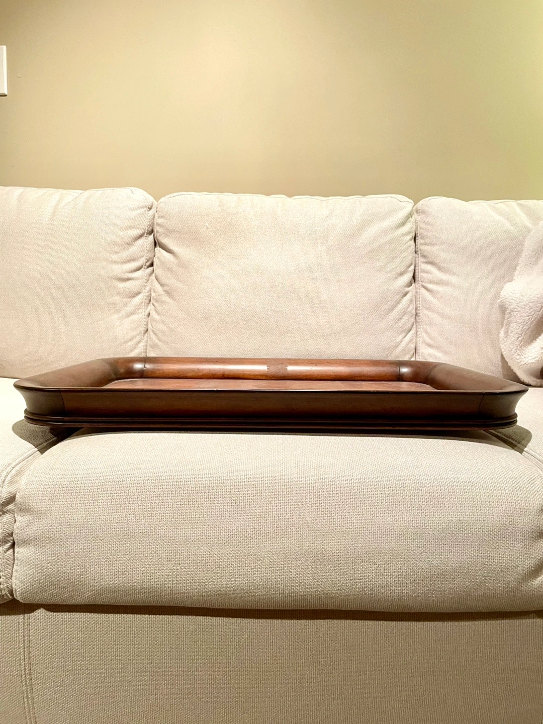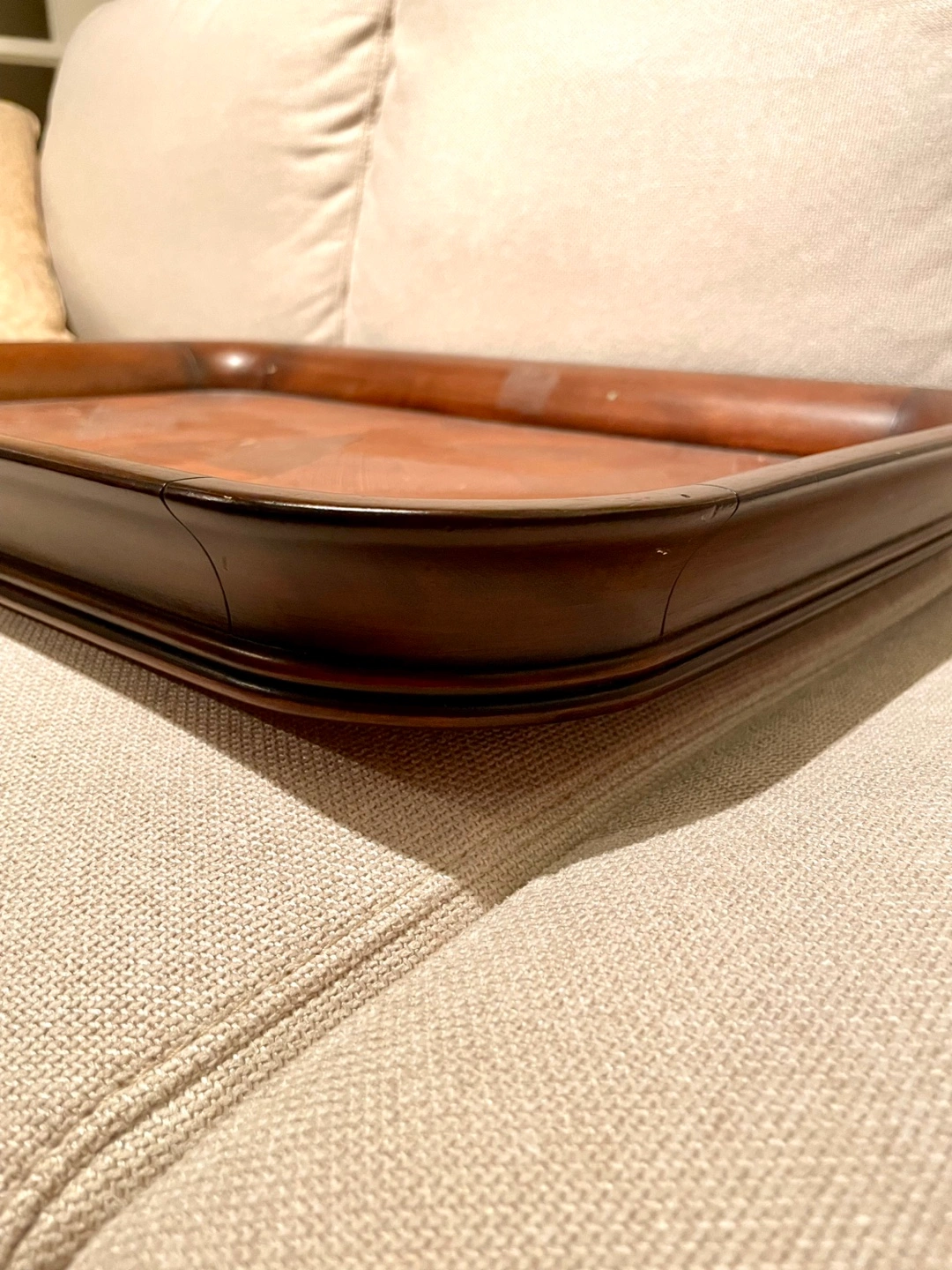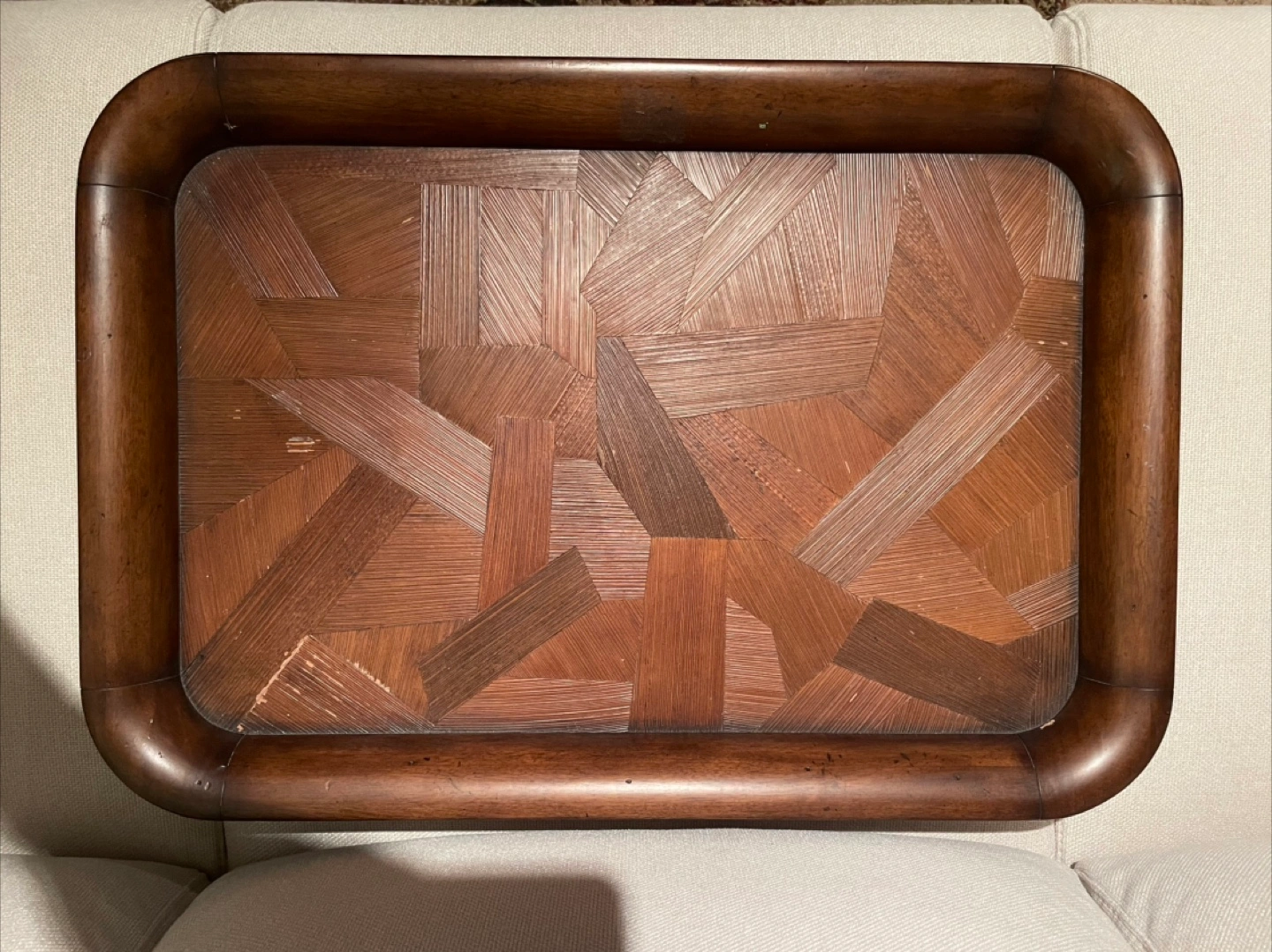 Large wood serving tray with a beautiful pattern on the inside and a smooth, dark wood finish around the edges. 26” L x 18” W x 2” H. If it’s listed, no need to ask! IT’S AVAILABLE!! Perfect for serving snacks and drinks at a great price of $10! Check out my other listings too!
