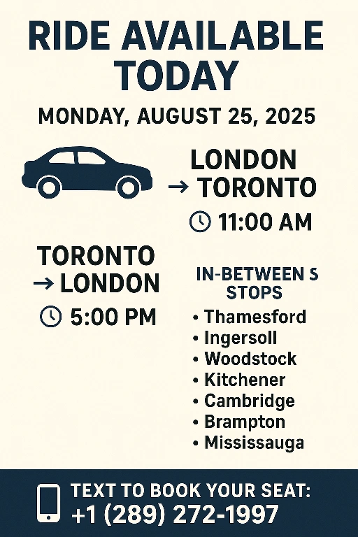Looking for a reliable ride? Seats available for today, Monday, August 25, 2025. London โ Toronto at 11:00 AM Toronto โ London at 5:00 PM โ Comfortable ride โ On-time departure and return โ Convenient stops: Thamesford, Ingersoll, Woodstock, Kitchener, Cambridge, Brampton, Mississauga ๐ฒ Text now to book your seat: +1 (289) 272-1997
