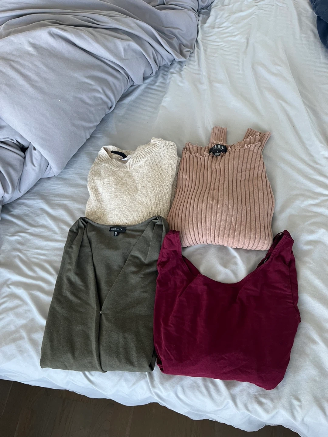 Selling a bundle of assorted women's clothing. Includes a variety of tops, sweaters, and a romper. Brands include Talula, Le Chateau, and others. Price is for all. Contains 8 pieces of clothing