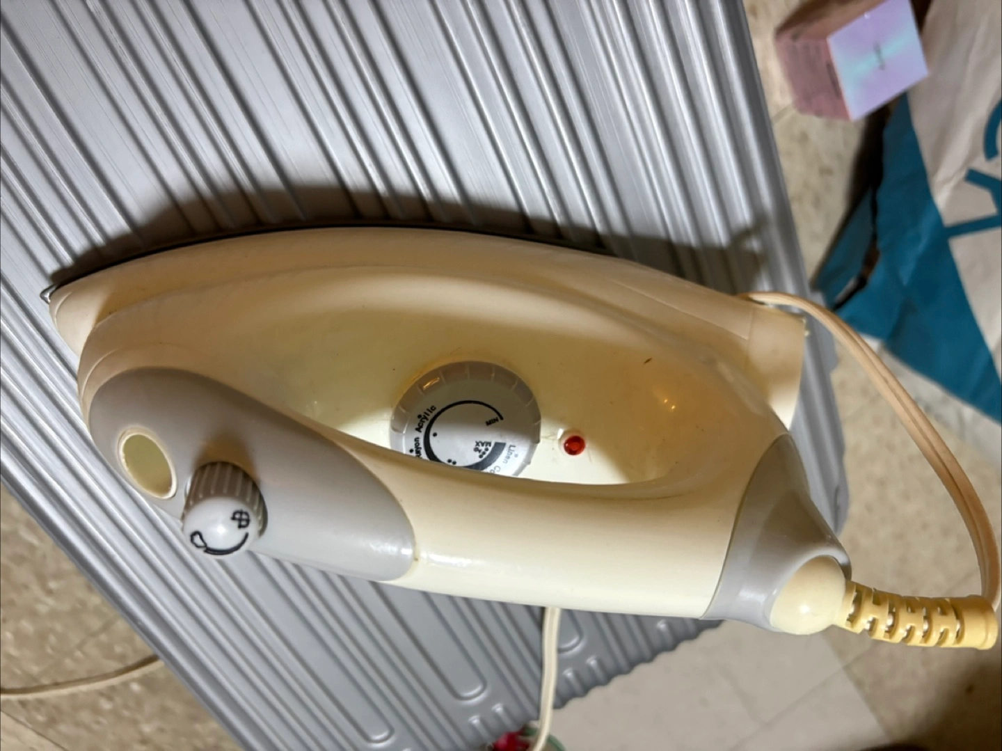 Selling a vintage iron that's still in working condition. It has a dial to adjust the temperature for different fabrics. It has a light to indicate when it's heating up. A charming piece for your ironing needs!
