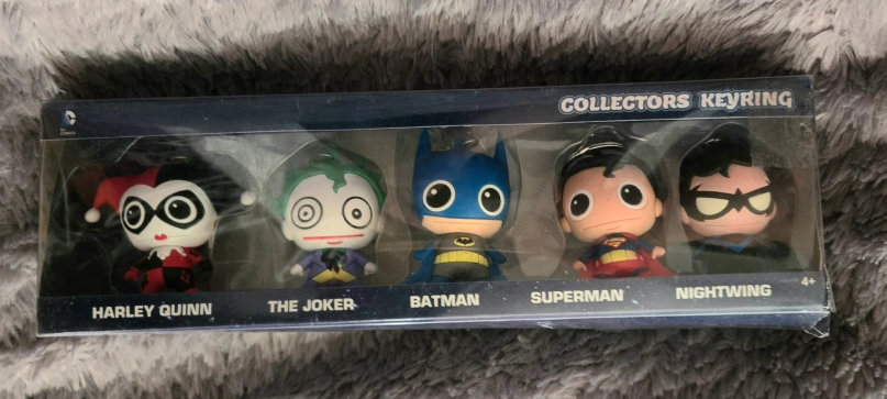 Selling a DC Comics Collectors Keyring set featuring Harley Quinn, The Joker, Batman, Superman, and Nightwing! The set is brand new and still in its original packaging, perfect for any DC fan or collector Box is a bit damaged from storing. Check my other listing.