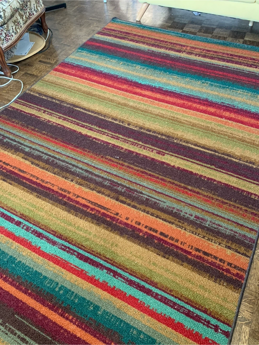 Selling a vibrant striped area rug! It features a beautiful array of colours, perfect for adding a pop of colour to any room. It's in great condition and ready for a new home. This rug would be perfect for a living room, bedroom, or even a kids' play area