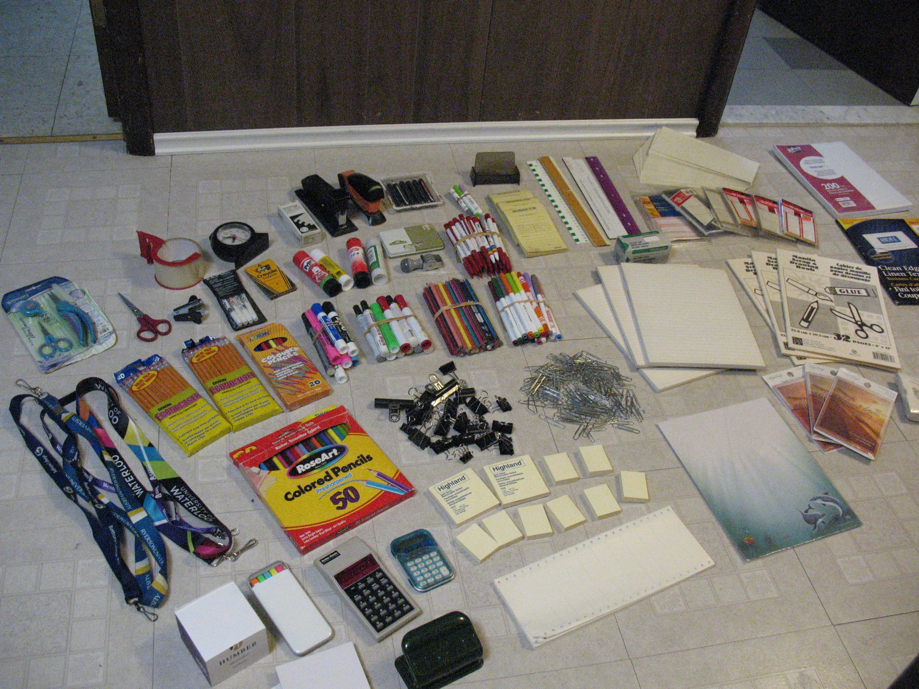 Huge lot of stationery items, office or school supplies. INCLUDES : * over 50 pens * over 40 pencils * over 40 markers * glue sticks * post it notes * 2 stapler with staples * 2 calculators * clock * highlighters * note pads/paper (over 150 sheets) * sketch pads * message pads * rulers * over 180 coloring pens/markers * clear tape * scisssors * 3 ring paper (200 sheets) * photo copy paper * over 100 large paper clips * stamp pad * over 300 small size self adhesive labels * over 500 large size self adhesive lables * over 80 regular size envelops Etc, etc, etc, Too many to list. Please see the photos. Perfect for students or office use. Some items are new, others used. Serious inquires only please. Please no low-balling. $80 647 709-6005