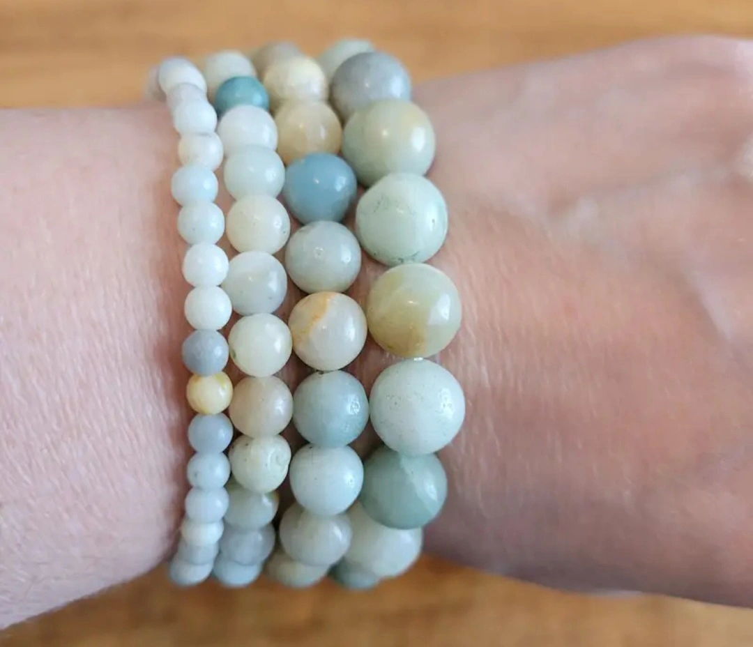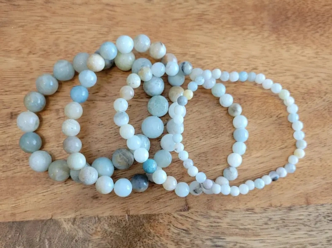 I'm selling a set of four beaded gemstone bracelets. They feature a lovely mix of light blue and white shades.