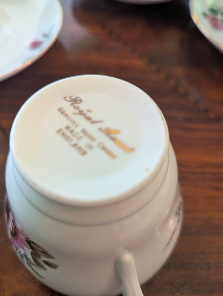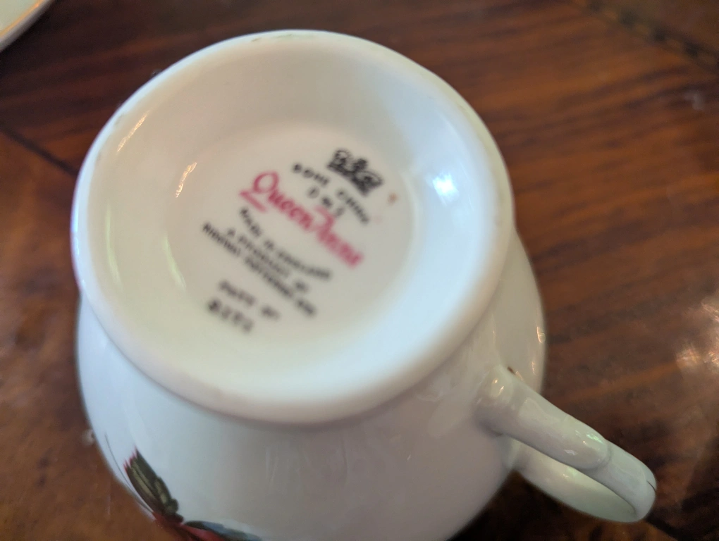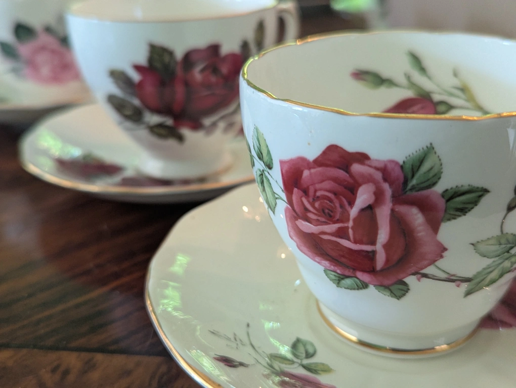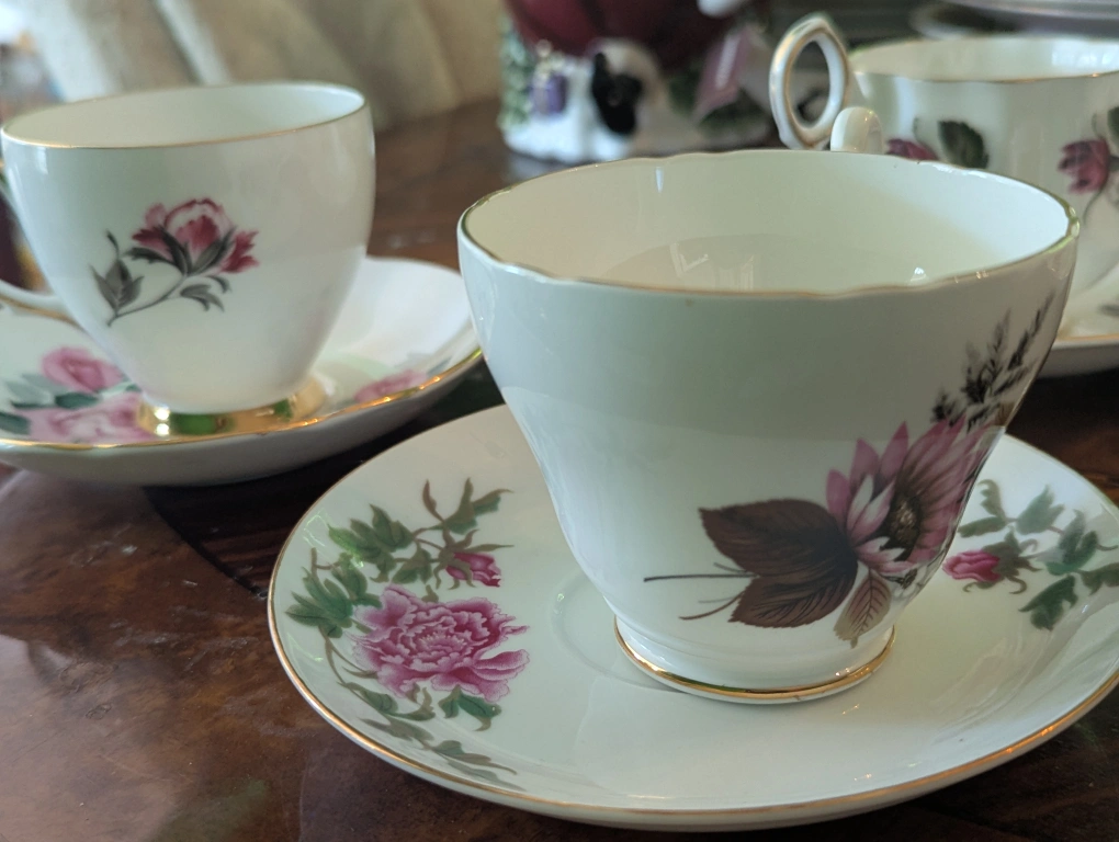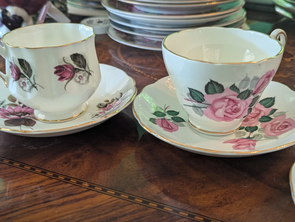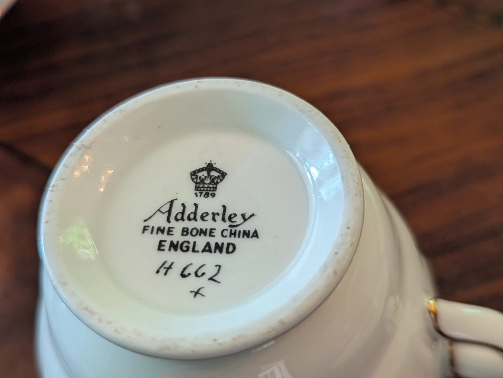 Selling a lovely tea cup and saucer set from Adderley Fine Bone China, made in England. The cup and saucer feature a beautiful rose pattern with gold trim. Perfect for adding a touch of elegance to your tea time! other Queen Anne Windsor see pictures