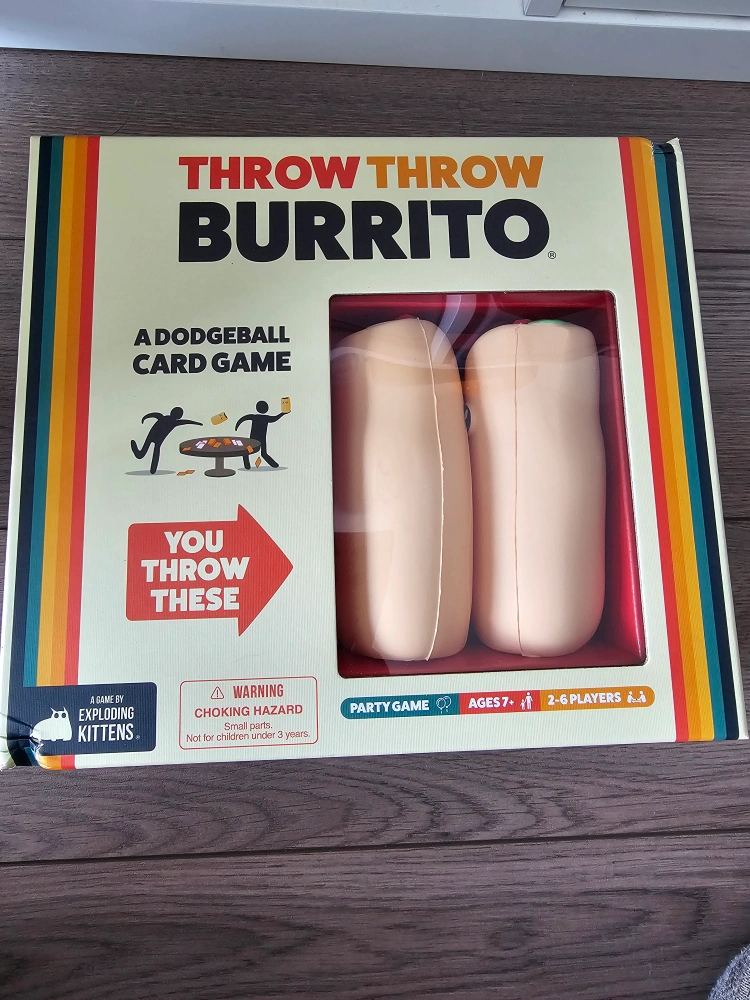 This is Brand New Throw Throw Burrito, a dodgeball card game by Exploding Kittens! It's a party game for ages 7+ and can be played with 2-6 players.