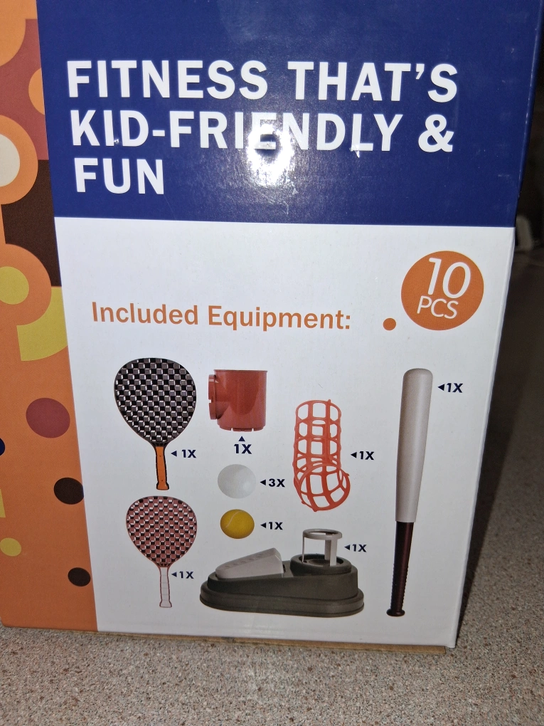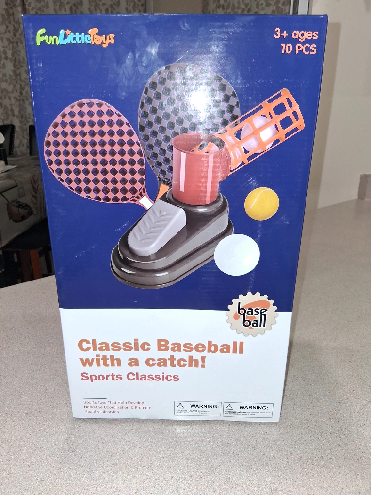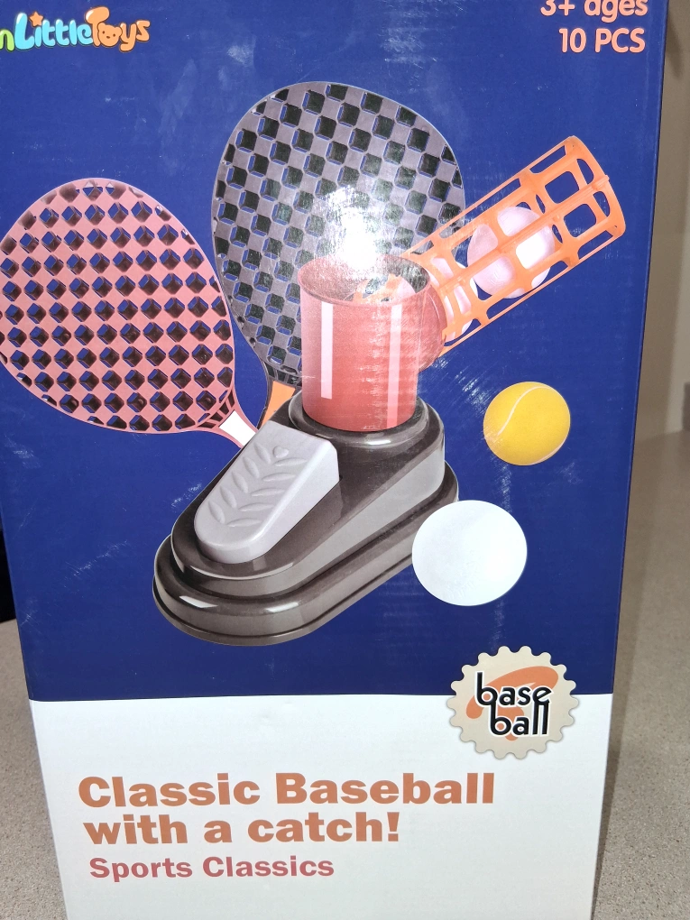 I'm selling a brand new Fun Little Toys Classic Baseball with a Catch! It's a sports classic that helps develop hand-eye coordination and promote healthy lifestyles. It's fitness that's kid-friendly and fun! The box includes 10 pieces of equipment, including: - 2 Rackets - 4 Balls - 1 Baseball bat - other components
