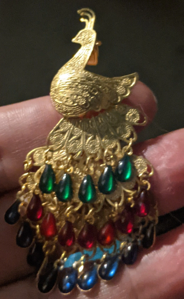 Beautiful peacock brooch featuring gold detailing and colourful accents. It's in great condition and ready to add a touch of elegance to any outfit