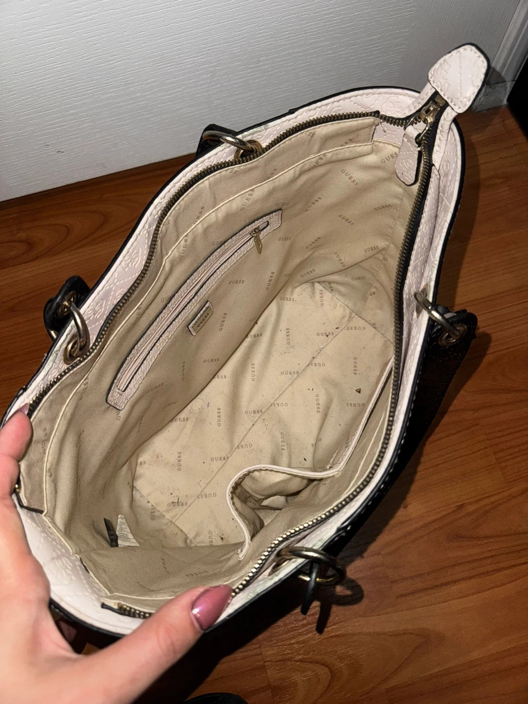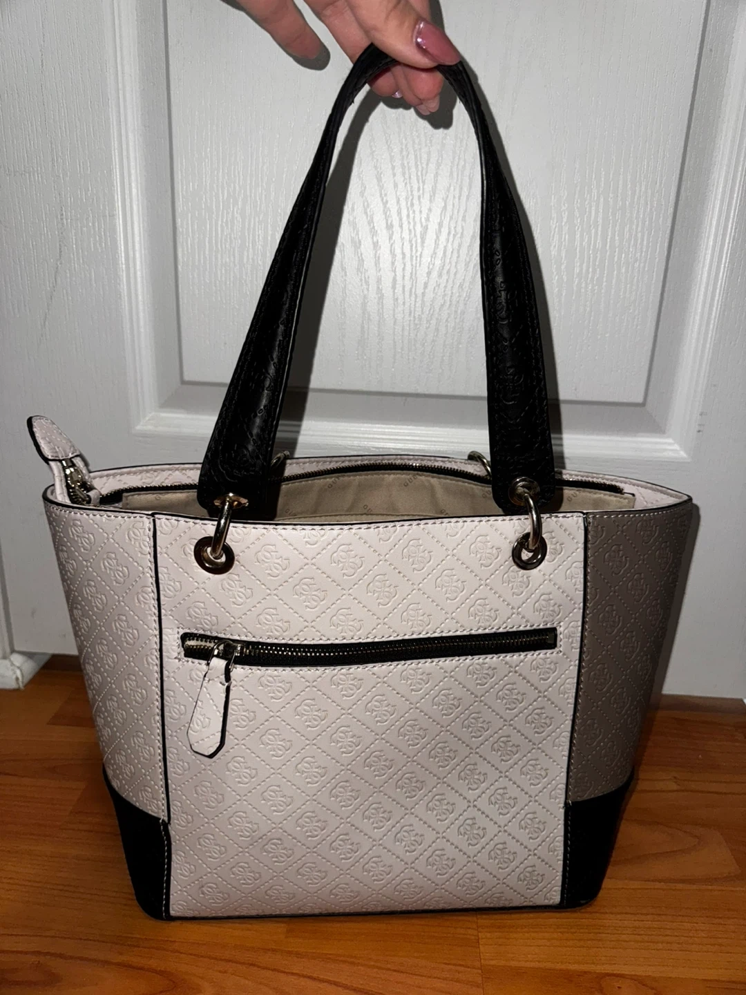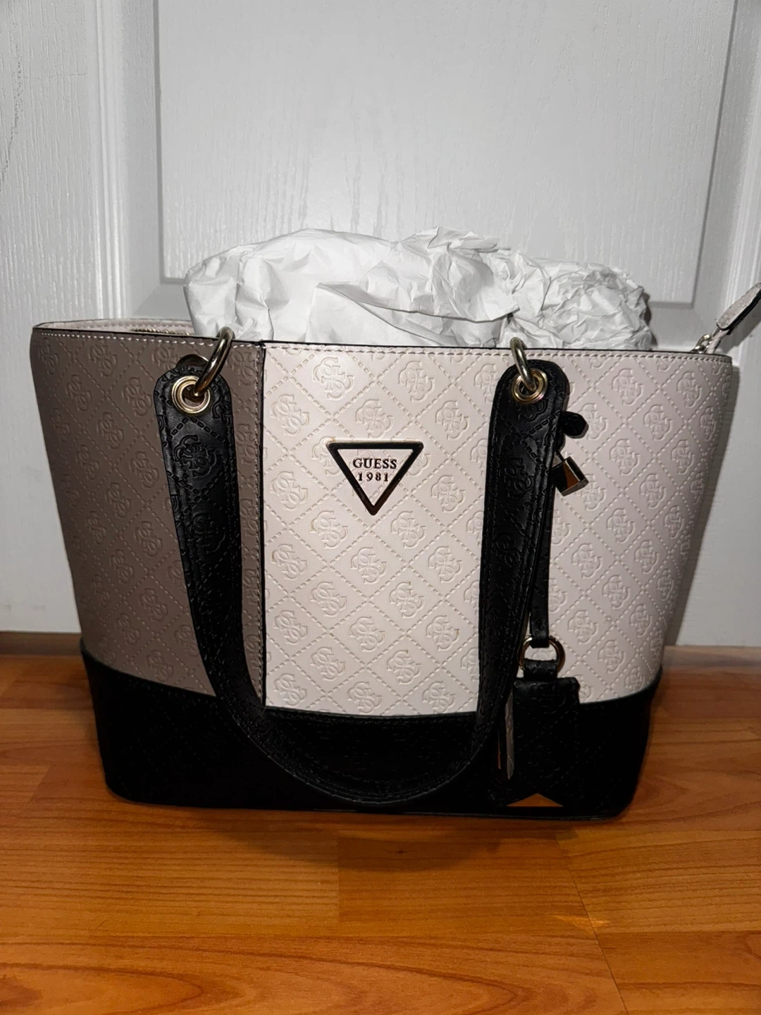 Selling a Guess tote bag in great condition! It features a stylish colour block design with black, white, and grey panels. Perfect for everyday use and comes with a dust bag to keep it protected.