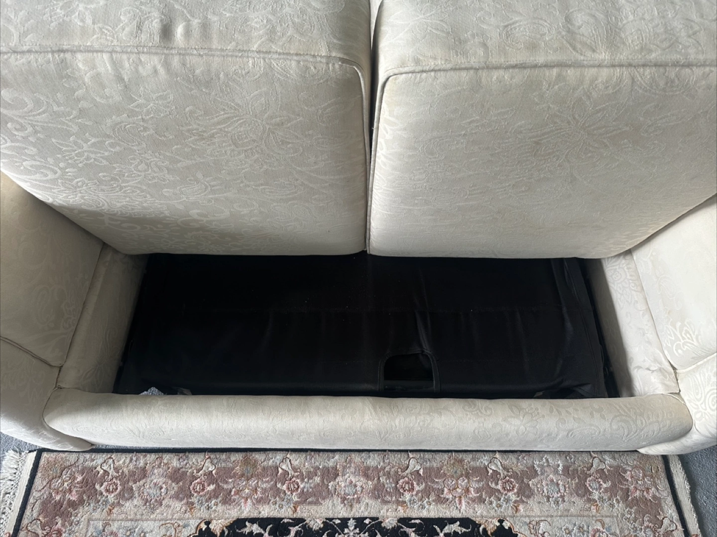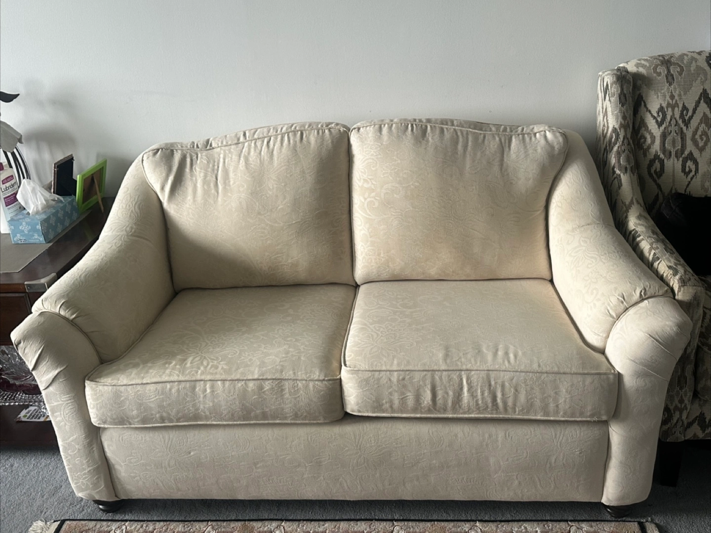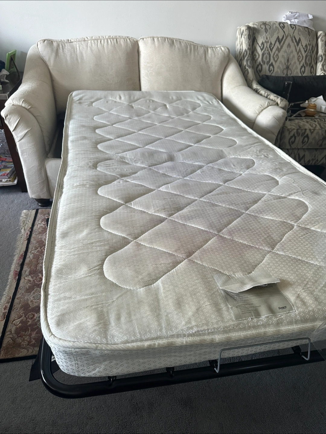Selling a loveseat sofa that comes with a built-in single pull-out bed. A fitted mattress for the pull-out bed is included at no extra cost. The mattress is clean, but does have some discoloration and stain spots. • Sofa is fairly heavy, so please plan accordingly for moving. • If the ad is up, it’s still available. • You’re welcome to come see it in person with advance notice. • For purchase, I’ll need to book the elevator and arrange a specific time slot, so please let me know ahead of time. Feel free to reach out if you have any questions!