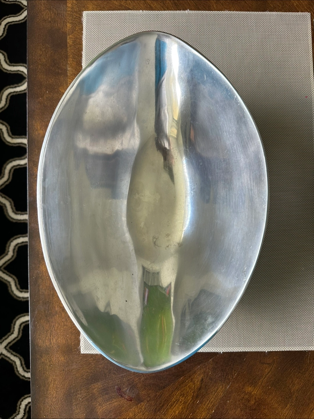 Here's a simple silver serving bowl. It has an oval shape and would be perfect for serving salads or other dishes at your next get-together!