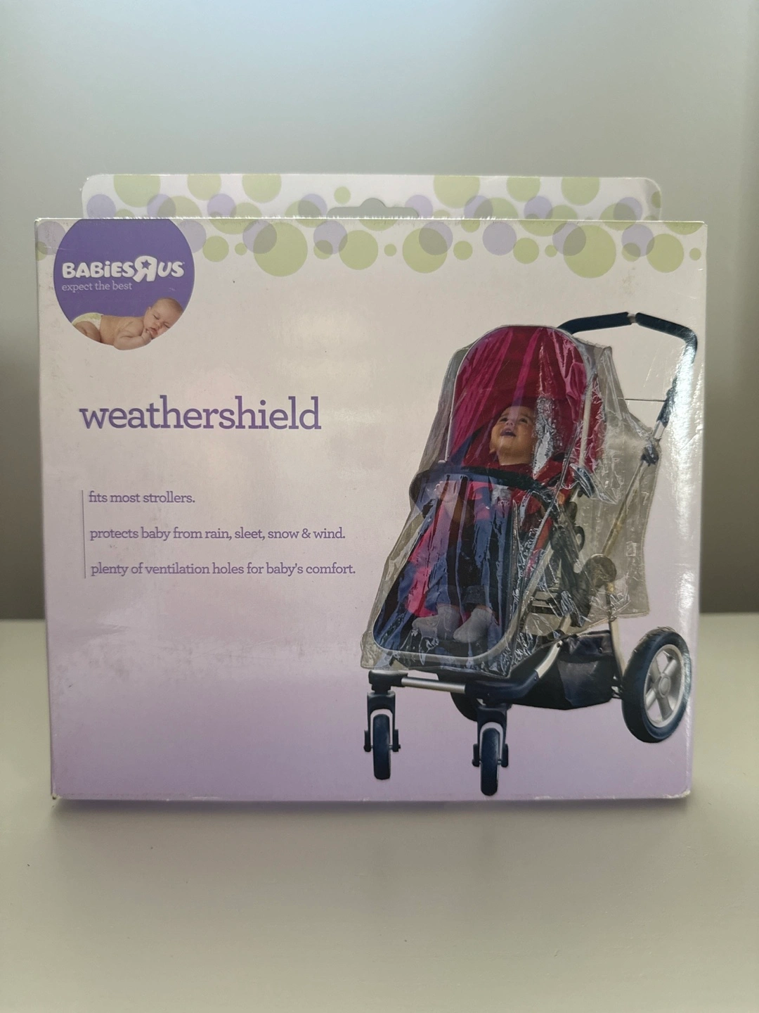 Keep your little one dry and comfy with this Babies R Us weathershield! It fits most strollers and protects baby from rain, sleet, snow, and wind. Lots of ventilation holes for baby's comfort