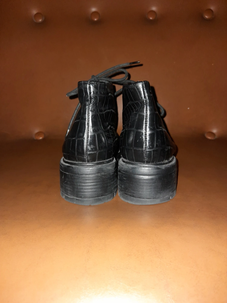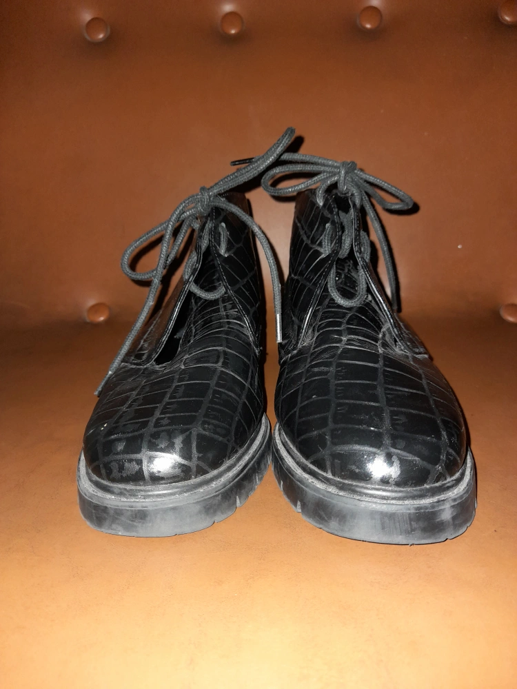 These black ankle boots feature a cool crocodile pattern! They're in great condition and ready for a new home. They have a lace-up closure and a chunky sole, perfect for adding a bit of edge to your outfit