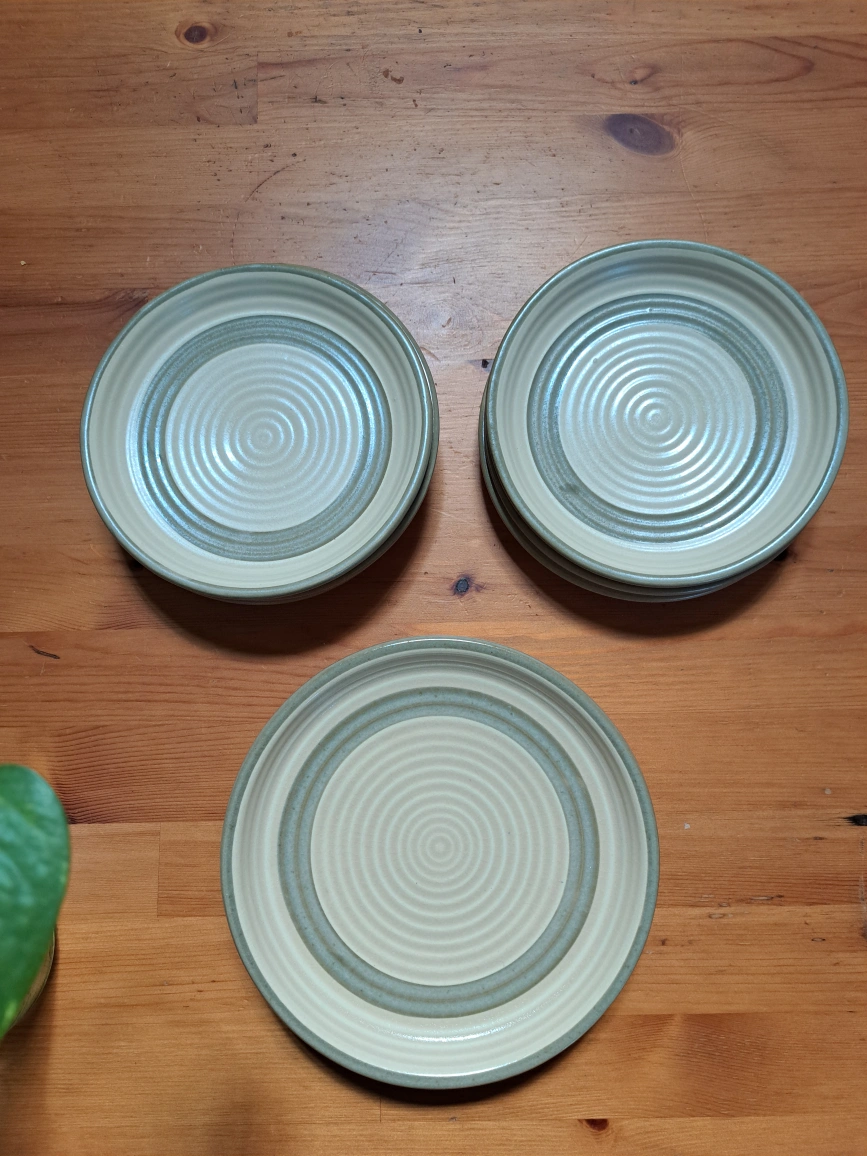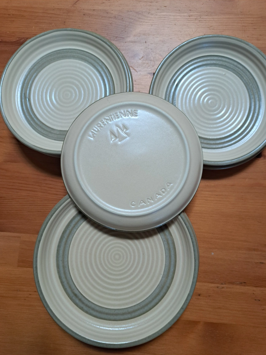 6 small (~6.75" diameter) and 3 medium (~7.5" diameter) round plates. Laurentienne Canada. Cream/beige ceramic with sage green rings. Plate surfaces are all in great condition save for one that has a small scuff in the paint, but some of the bottoms have chips in them.