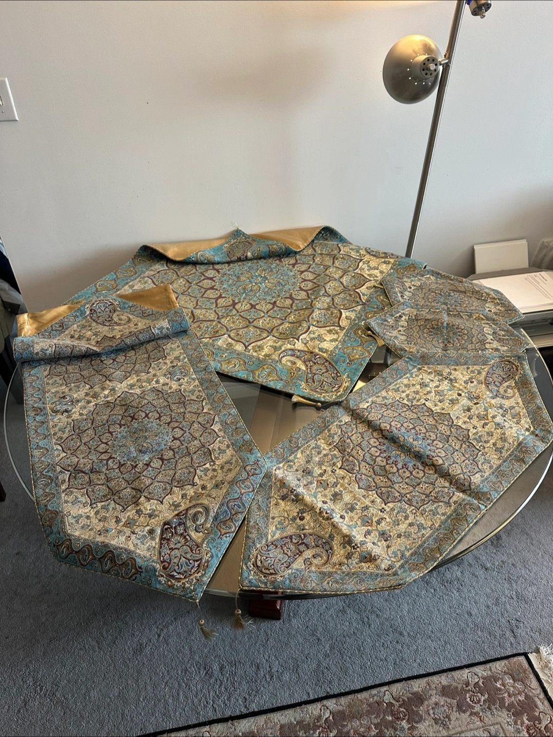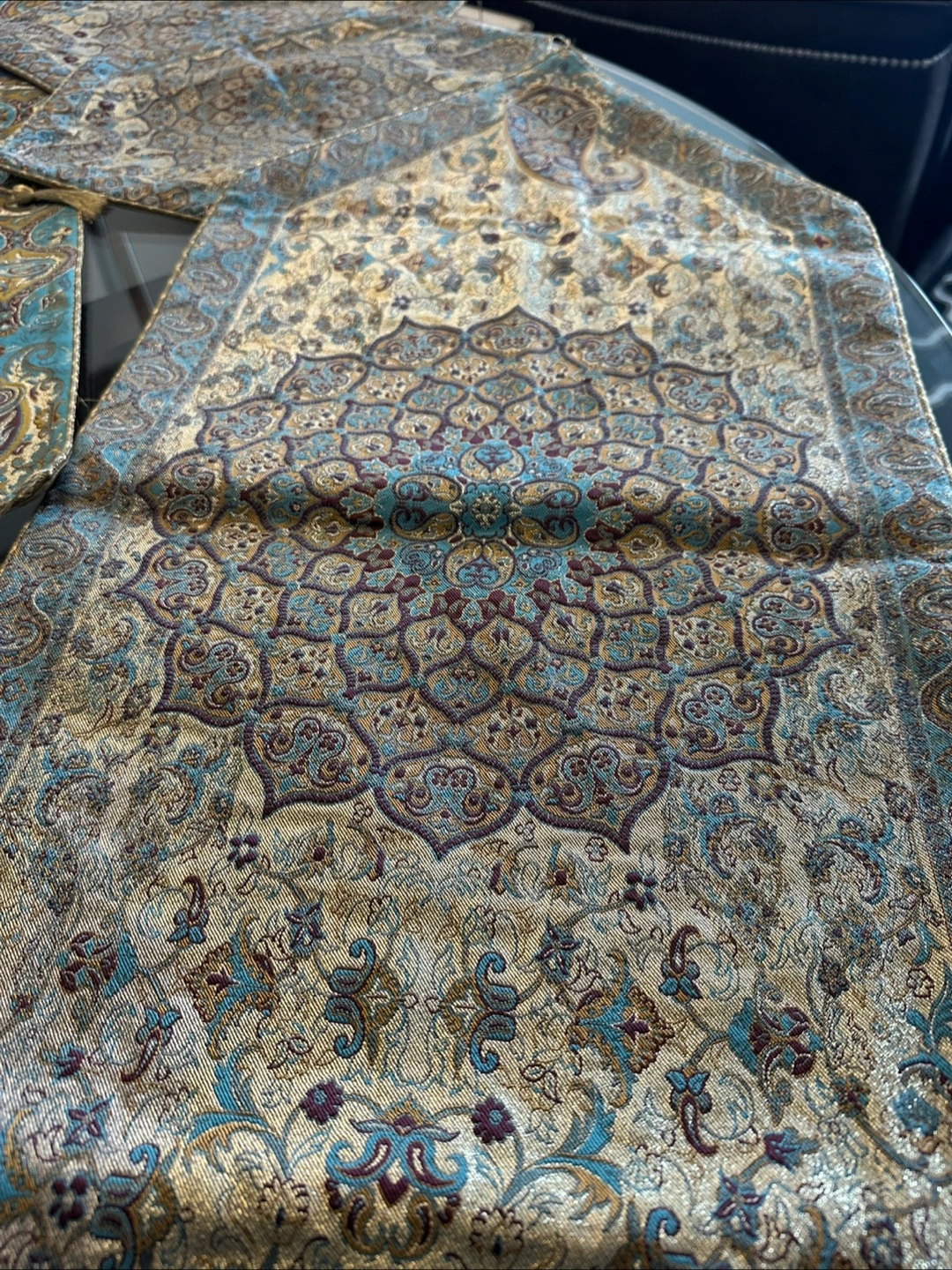 This is a lovely hand crafted patterned Persian tablecloth set. It would look great in your dining room or kitchen! 5 pieces