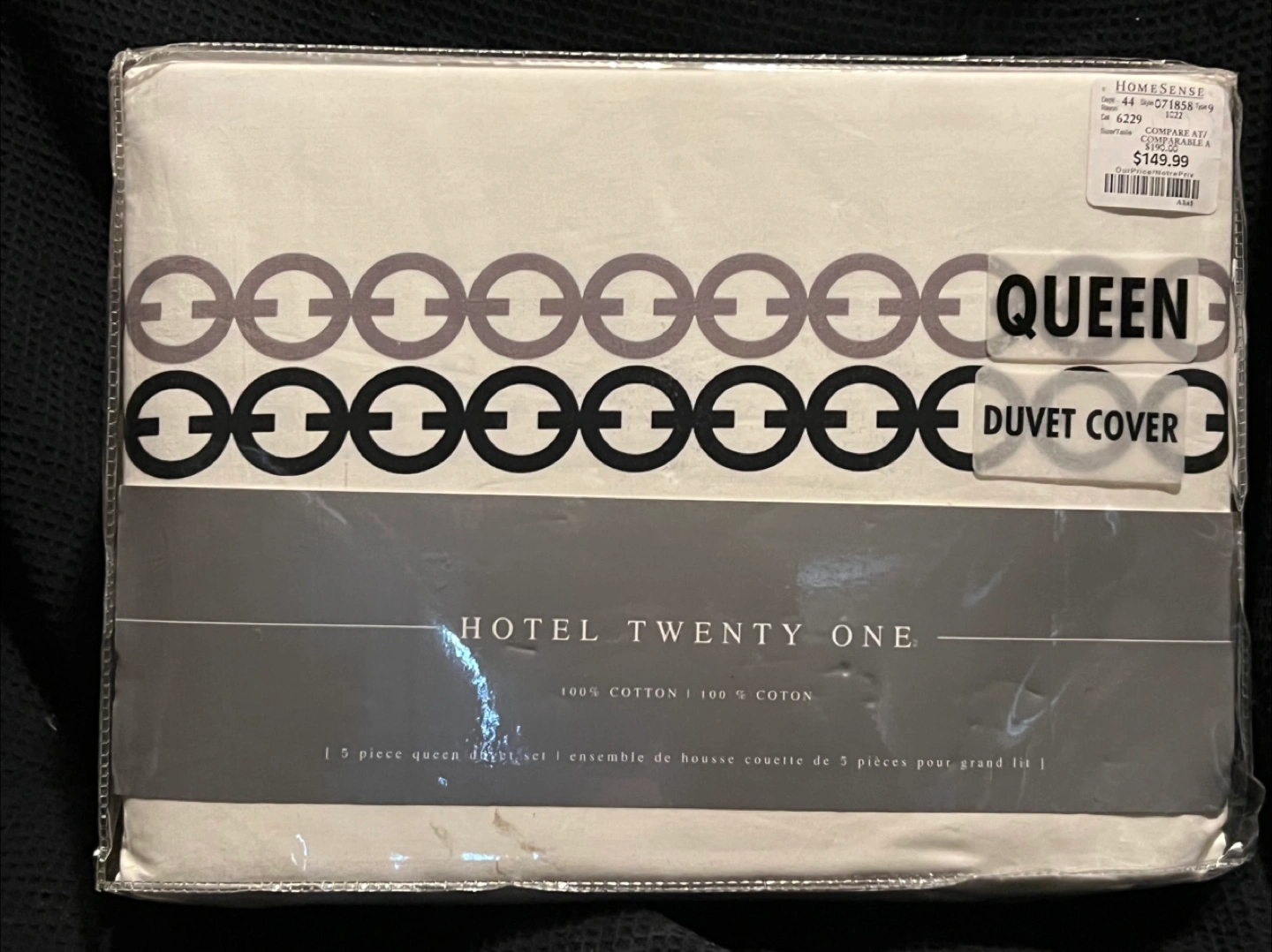 I'm selling a Hotel Twenty One queen duvet cover set! This set is brand new and still in its original packaging. It's a 5-piece set made from 100% cotton. Originally bought for $149.99.