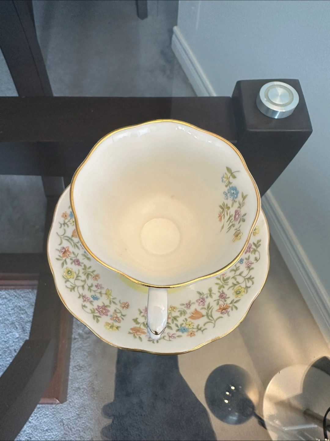 Selling a lovely tea cup and saucer set. It features a delicate floral pattern with a gold trim, perfect for adding a touch of elegance to your tea time