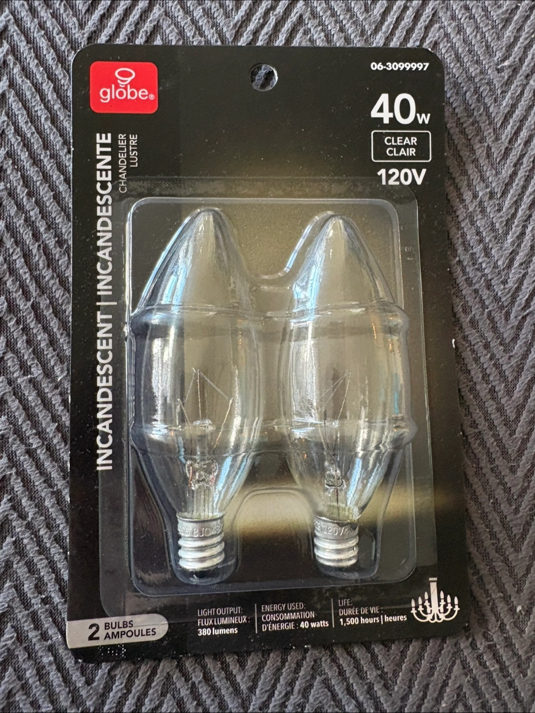I'm selling a brand new pack of Globe chandelier light bulbs! This pack includes two 40W clear bulbs designed for chandeliers and decorative lighting fixtures. They provide 380 lumens of light output and have a lifespan of 1,500 hours. Perfect for adding a warm and inviting glow to your home!
