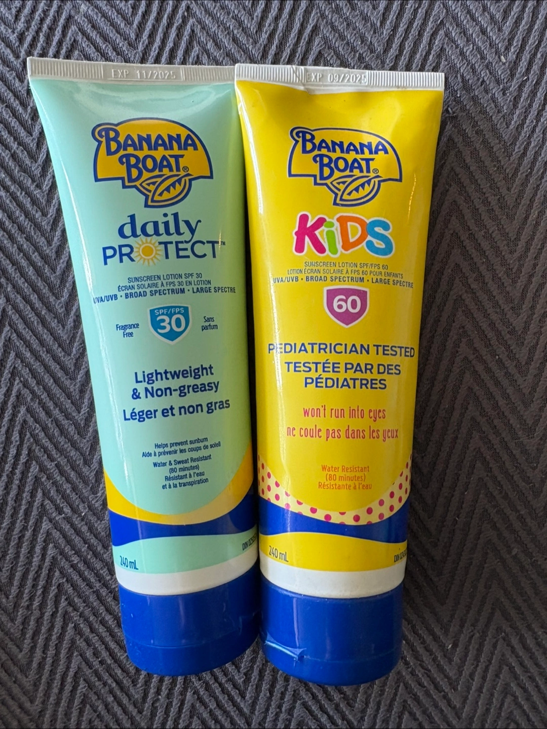 Selling two bottles of Banana Boat sunscreen! One is Daily Protect SPF 30, fragrance-free, lightweight and non-greasy. The other is Banana Boat Kids SPF 60, pediatrician tested and won't run into eyes. Both are 240 mL. - Expiry for Daily Protect: November 2025 - Expiry for Kids: September 2025