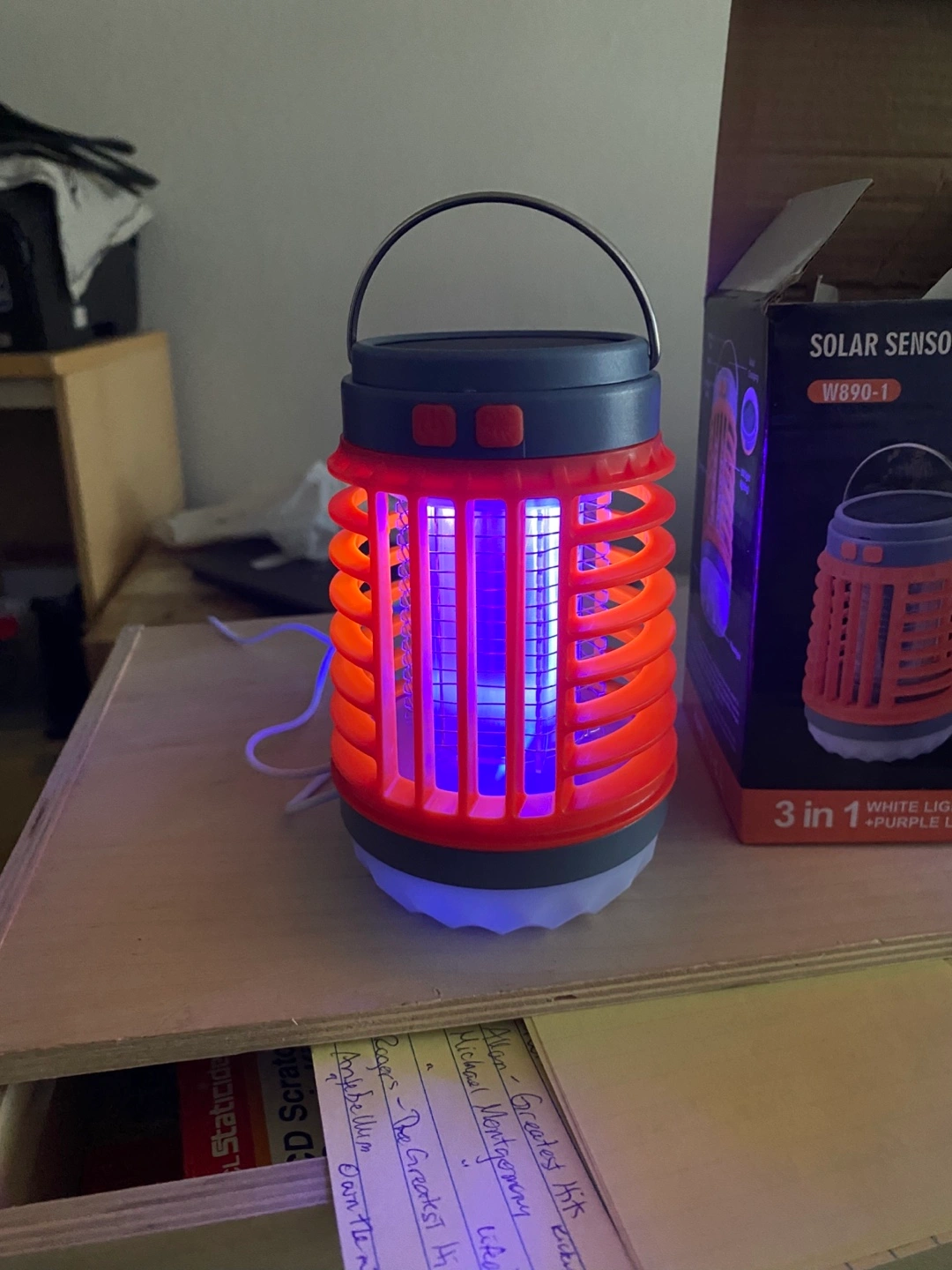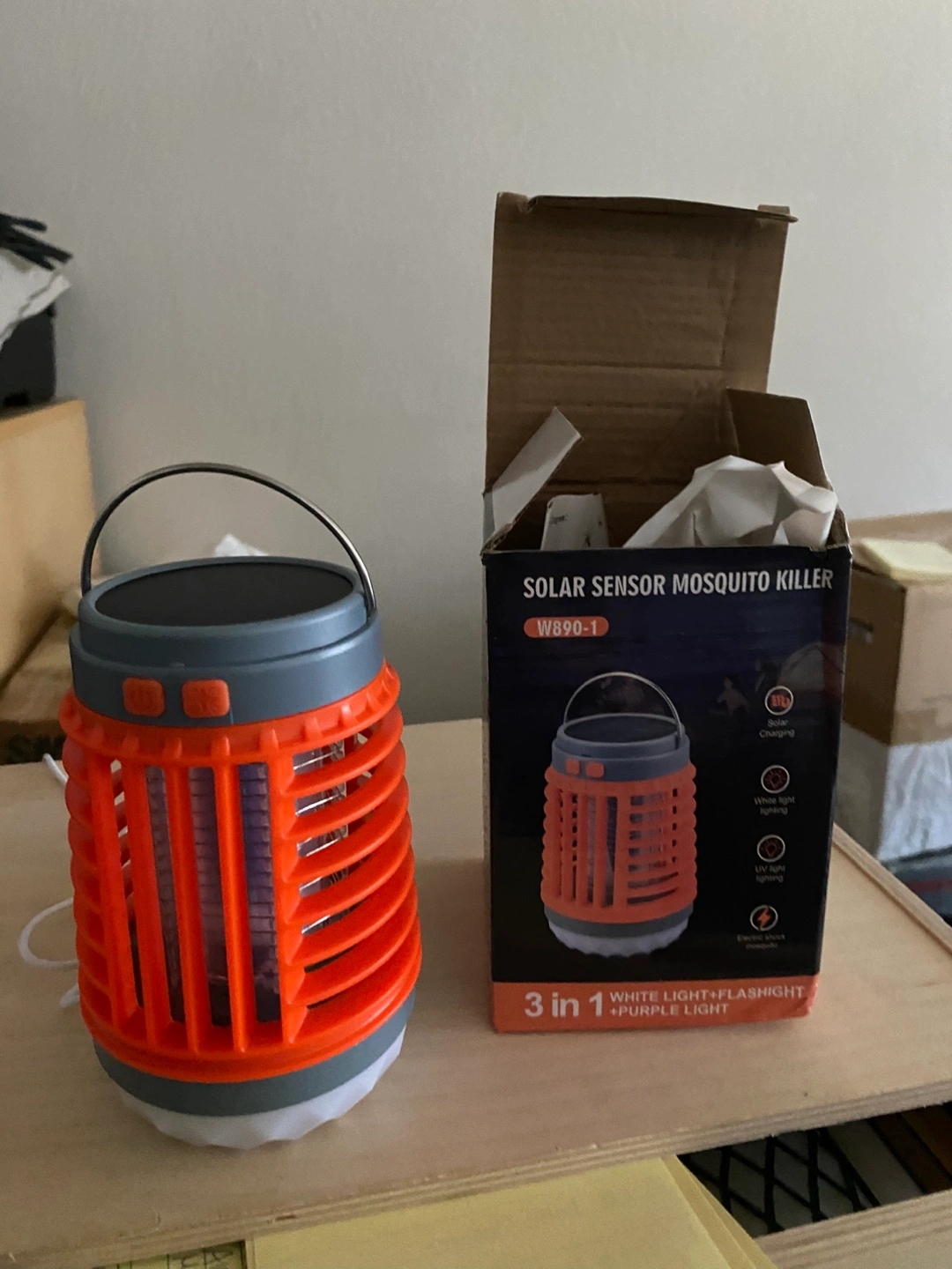 Selling a 3-in-1 solar sensor mosquito killer! This handy device features a white light, flashlight, strobe light, and purple light, making it versatile for outdoor use. It comes with its original box, instructions and charging cord. Great for camping or backyard hangs! Moving Sale Pick up only