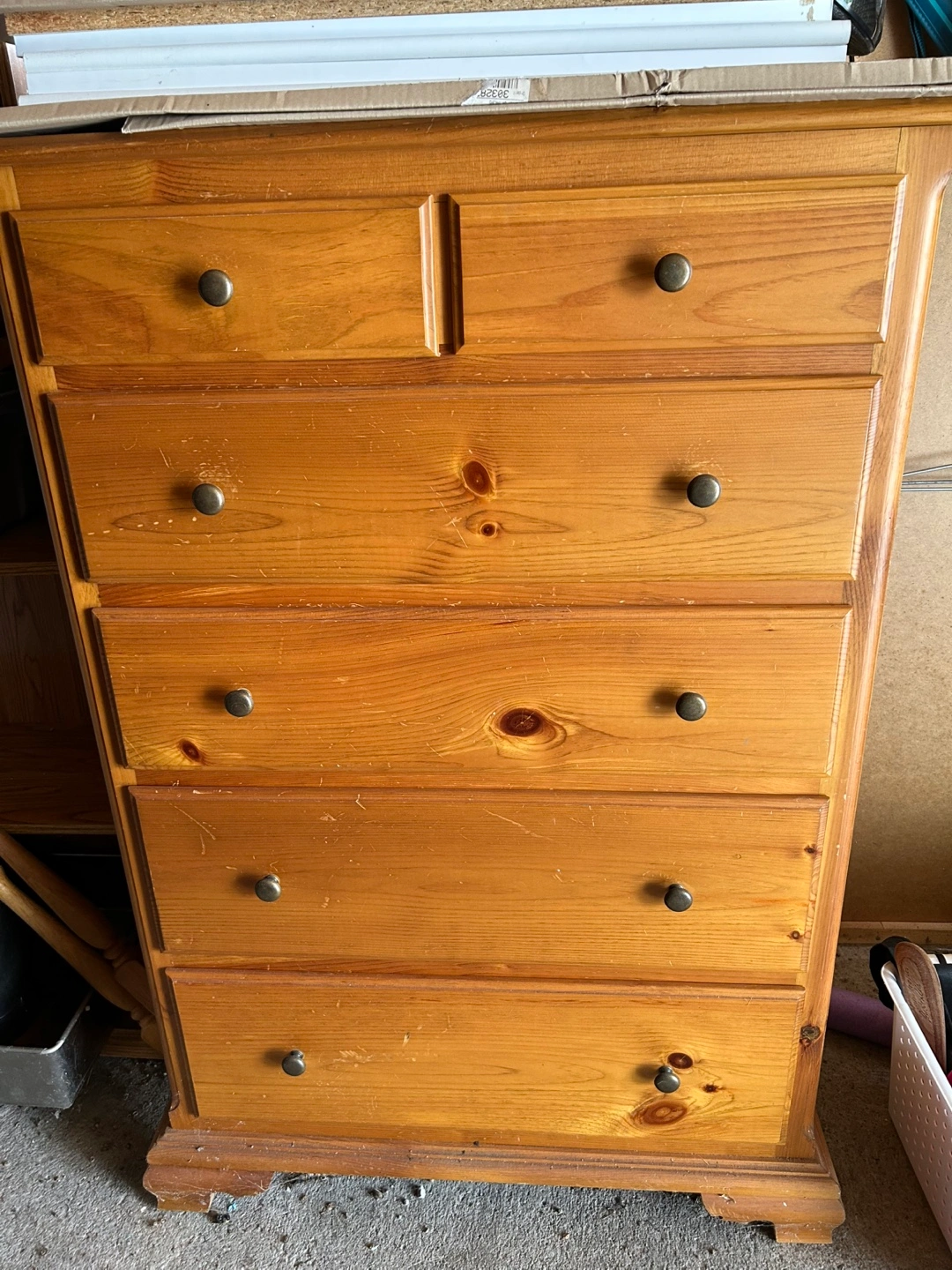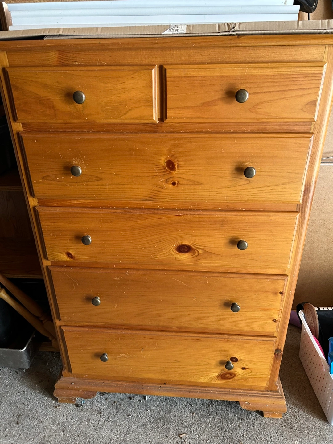 Here's a wooden dresser with six drawers. It's perfect for storing clothes or other items. The dresser is in okay condition and ready for a new home! Perfect for someone who wants a solid wood piece and is ok with scratches or happy to refinish.