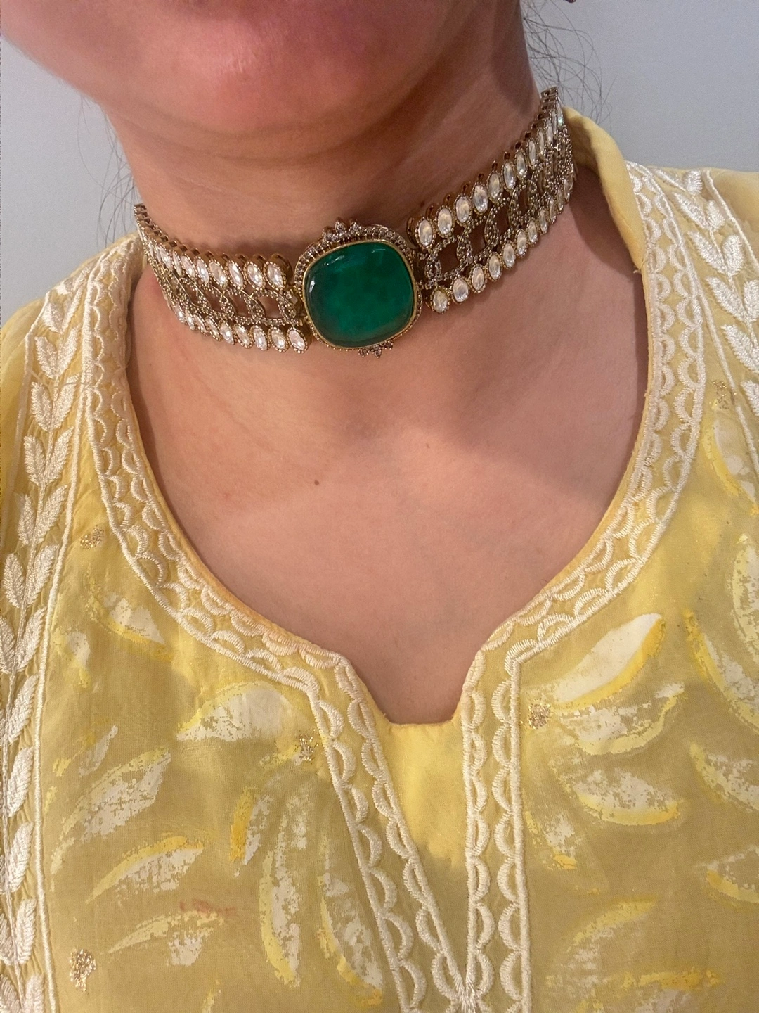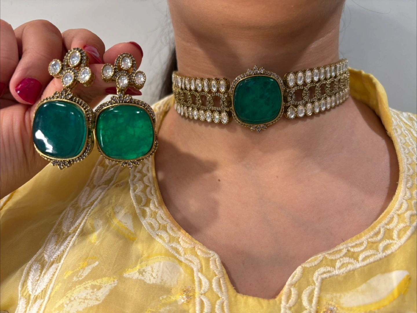 Selling a beautiful choker and earring set featuring emerald-coloured stones. The set has a detailed, ornate design. Perfect for adding a touch of elegance to any outfit!